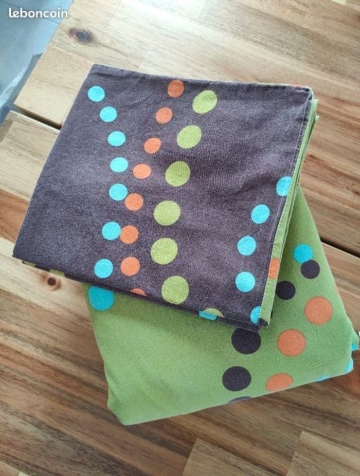 Je vends une parure de lit en bon état. Les taies d'oreiller mesurent 50x65cm et la housse de couette mesure 210x225cm. D'un côté vert à pois et marron à pois de l'autre.