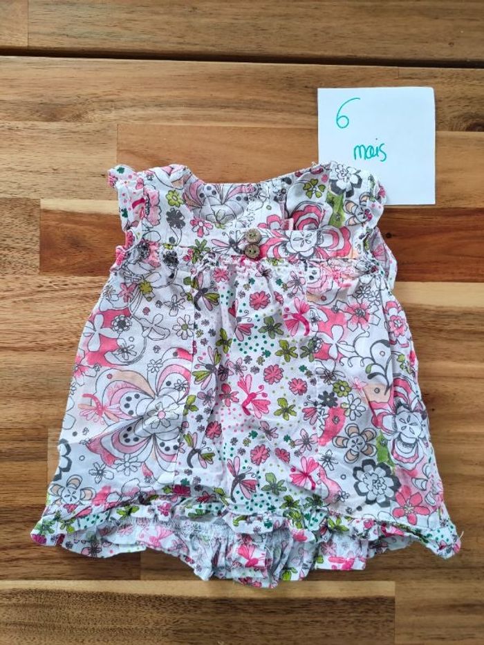 Tee-shirt marque Gémo. Type chemisier sans manche. Fleuri. Taille 6 mois. Très bon état.