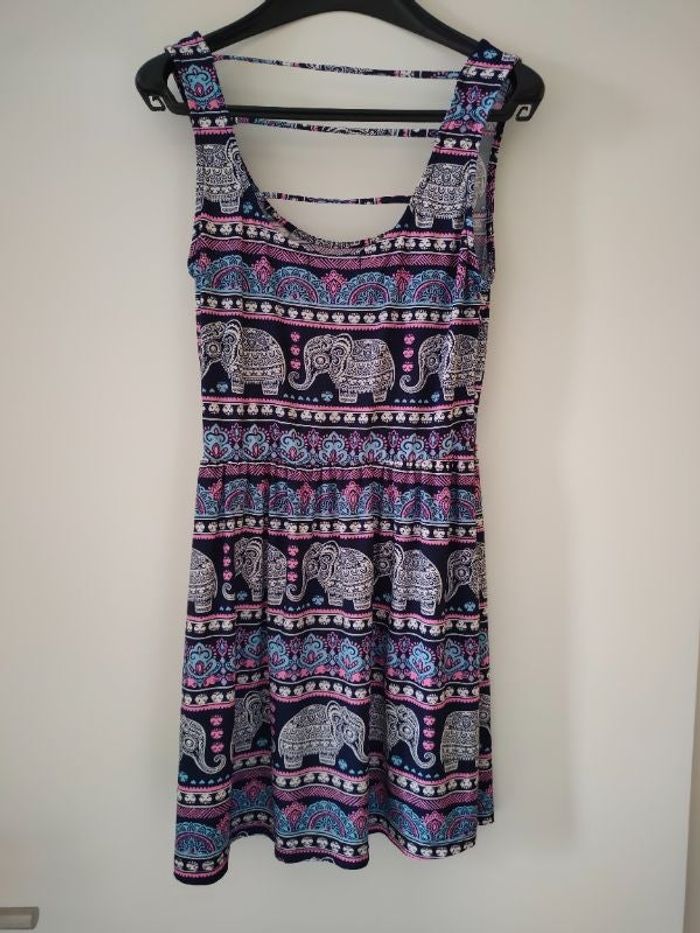 Robe courte légère de la marque Inside. Motif éléphant. C'est indiqué taille M, mais c'est plutôt un XS selon moi. Voir les mesures ci dessous. Aisselle à aisselle 32 cm Longueur robe (épaule jusqu'au bas) 73 cm. Neuve, jamais portée !