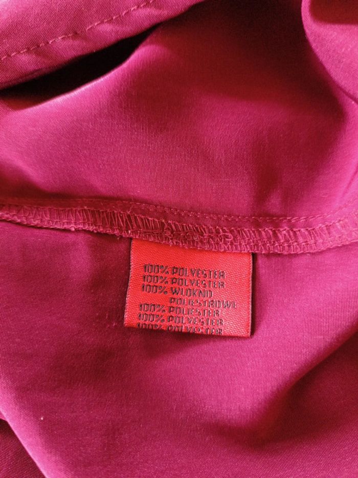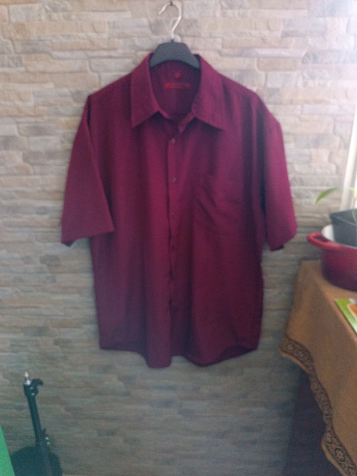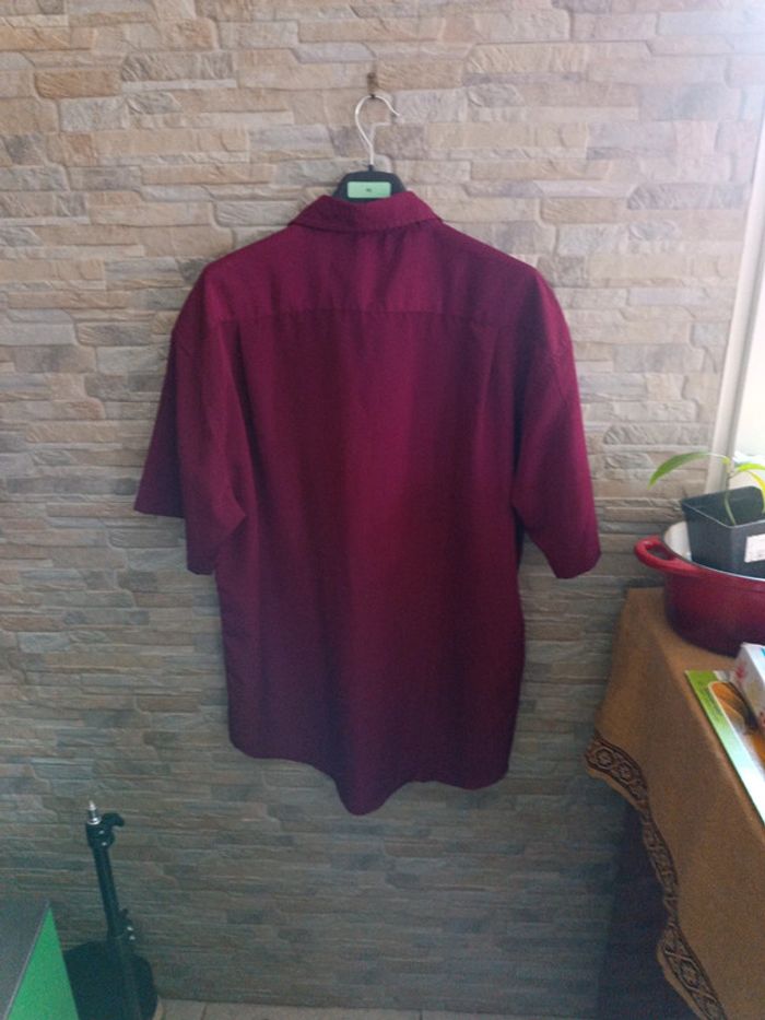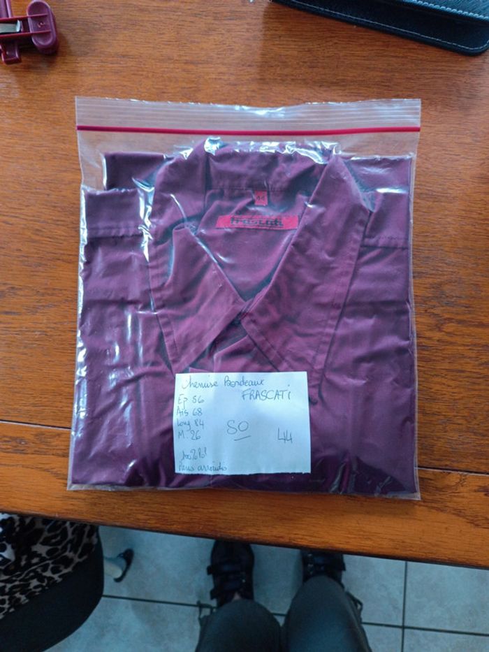 Chemise bordeaux Frascati 44. Épaules 56 cm. Aisselles 68 cm. Longueur 84 cm. Manches courtes 26 cm. Pans arrondis. 100% polyester. Comme neuve. TBE