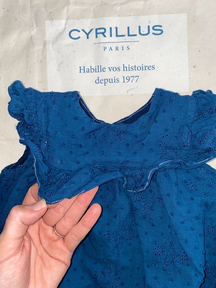 Robe Cyrillus 12 mois Elle a été teinte en bleue N’hésitez pas à faire des lots (en bas d’une annonce), j’ai beaucoup de choses dans mon dressing (fille garçon femme homme … ect toutes tailles) ☺️ L’astuce pour voir d’autres articles de la même catégorie ou de la même taille c’est que quand vous êtes sur un objet vous allez vers le bas et la Vinted va vous proposer des choses de mon dressing similaire à l’article que vous regardiez ☺️