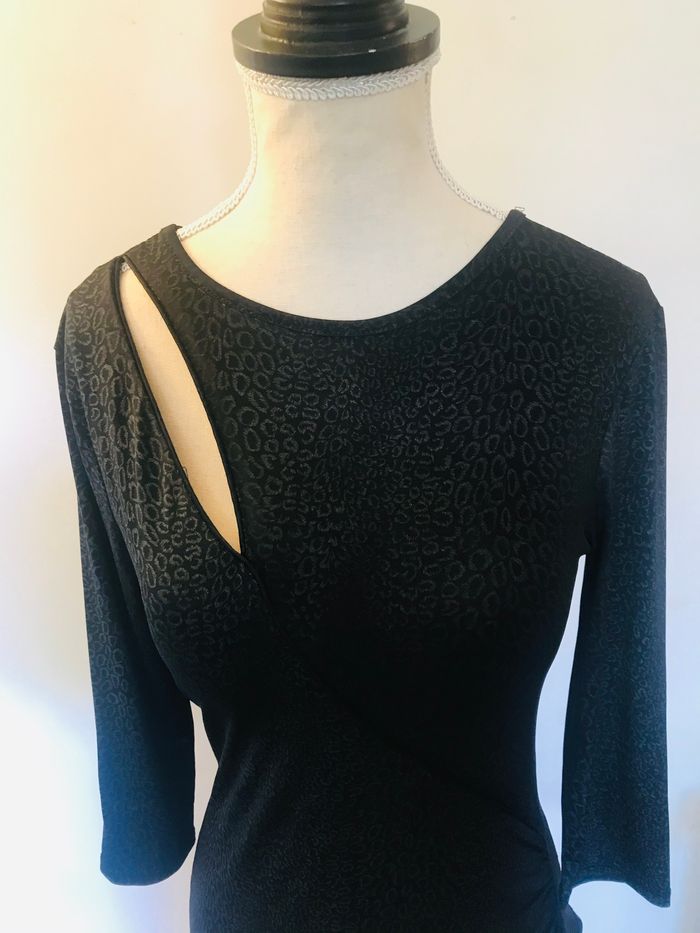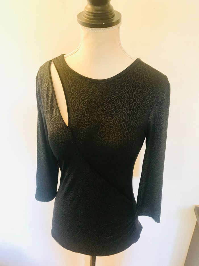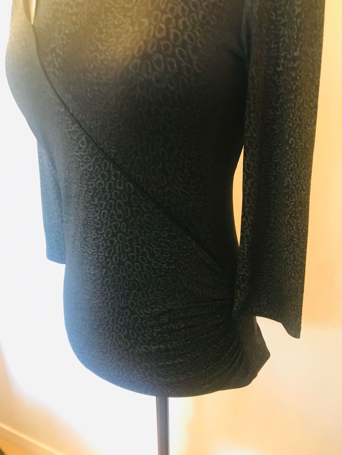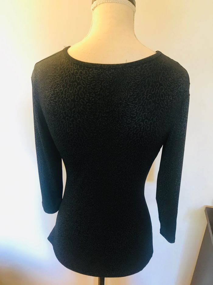 Tshirt fille taille 14 ans femme taille XS Couleur noir imprimé gris foncé Manches 3/4 Très bon état (Fr)