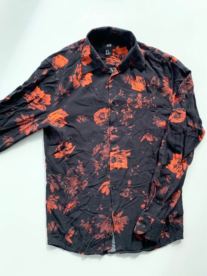 Chemise en tissu de viscose à motif imprimé. Modèle avec col rabattu et gorge simple. Manches longues terminées par poignet à boutonnage ajustable. Empiècement d’épaules dans le dos. Base arrondie avec un peu plus de longueur dans le dos. Slim fit - une coupe étroite avec une taille marquée et des épaules resserrées pour une silhouette ajustée. Très légère Coupe ajustée stretch. Slim fit Très agréable et confortable à porter Chemise boutonnée à manches longues avec imprimé roses 🌹 noires et rouges Nos vêtements sont toujours garantis sans taches, ni trou 👌🏻 Maison non fumeur, sans poils d’animaux