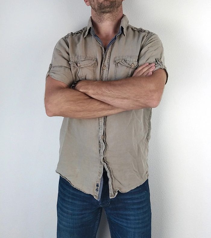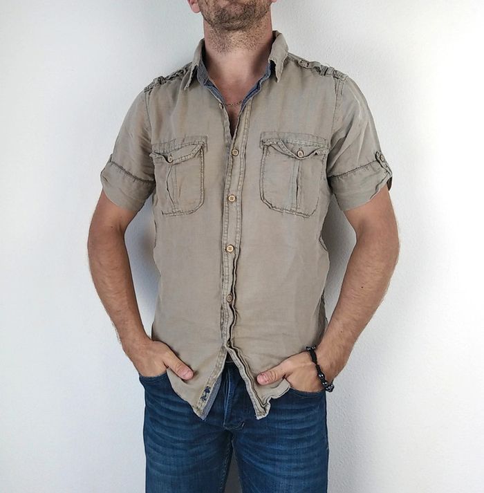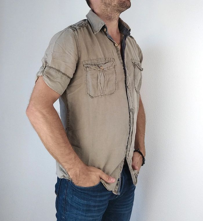 Fermeture centrale boutons 2 poches sur la poitrine Boutons aux manchettes Couleur kaki clair Nos vêtements sont toujours garantis sans taches, ni trous 👌🏻 Maison non fumeur, sans poils d’animaux