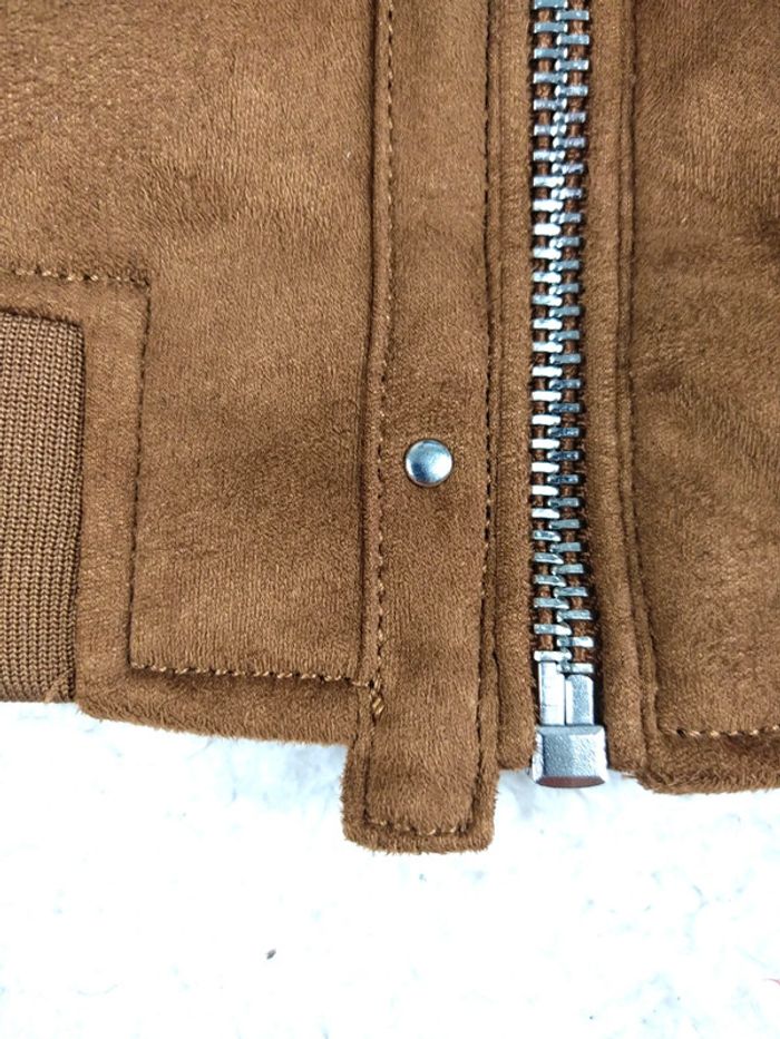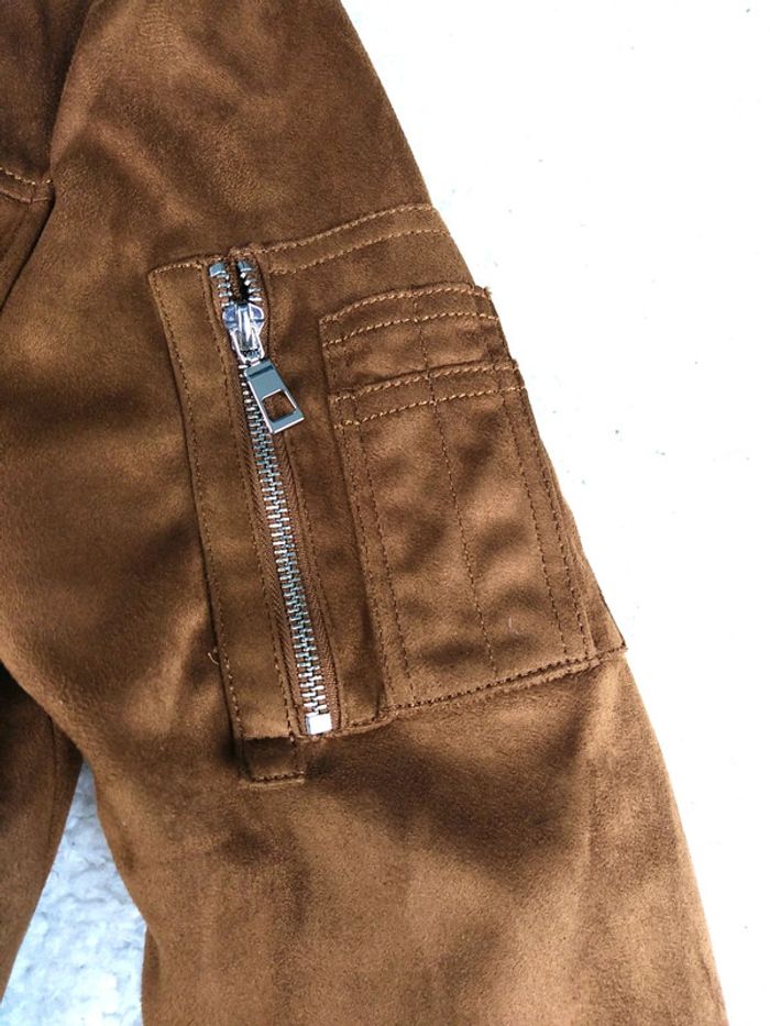 Taille S Effet daim couleur camel Superbe veste à manches longues. Entièrement doublée. Bord côte aux extrémités Zip de fermeture argenté 2 poches avant zippées 1 poche zippées sur la manches gauche Surpiqûres ton sur ton Nos vêtements sont toujours garantis sans taches, ni trous 👌🏻 Maison non fumeur, sans poils d’animaux