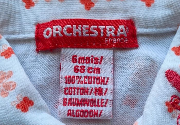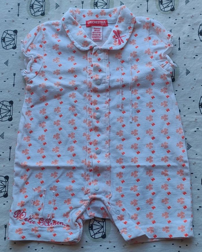 Barboteuse blanche avec fleurs et papillons orange en très bon état de la marque Orchestra pour bébé taille 6 mois. #neezia33240barboteusefille6mois