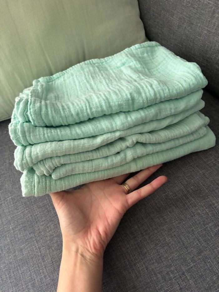Lot de 6 langes Mixte pour garçons ou filles Couleur vert menthe Taille 70x70 100% coton Passe au sèche linge Marque Dudu n girlie Tres bon état Certains ont été plus utilisé que d’autres mais reste en très bon état Acheté 20 euros sur Amazon