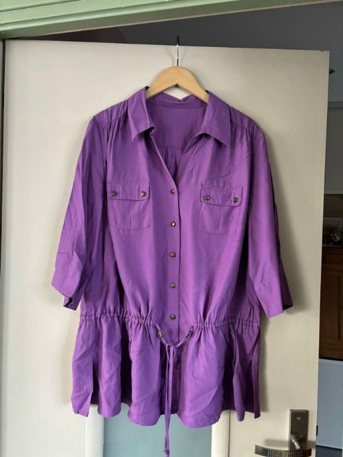 chemisier tunique violet avec des vrais boutons L'étiquette a été effacée, je pense que ça correspond à un 42/44 mais n'hesitez pas à demander les mesures pour être sûr.e de votre achat