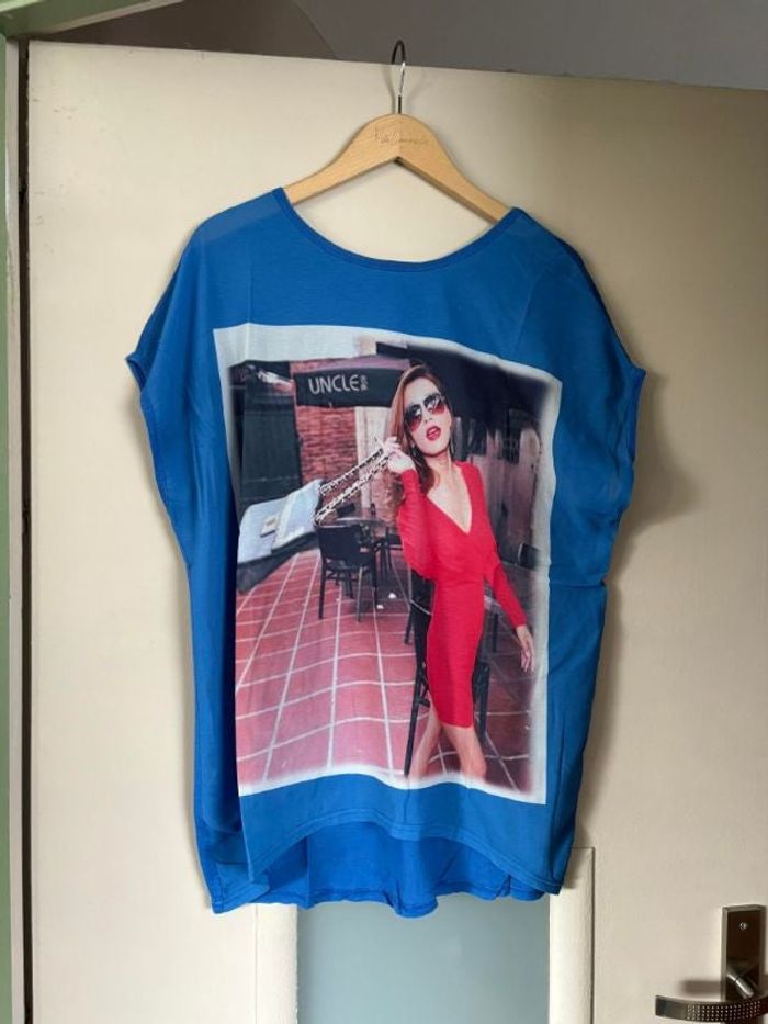 t shirt bleu motif femme l'étiquette est coupée mais je pense correspond à un 40 (n'hésitez pas à demander les mesures)