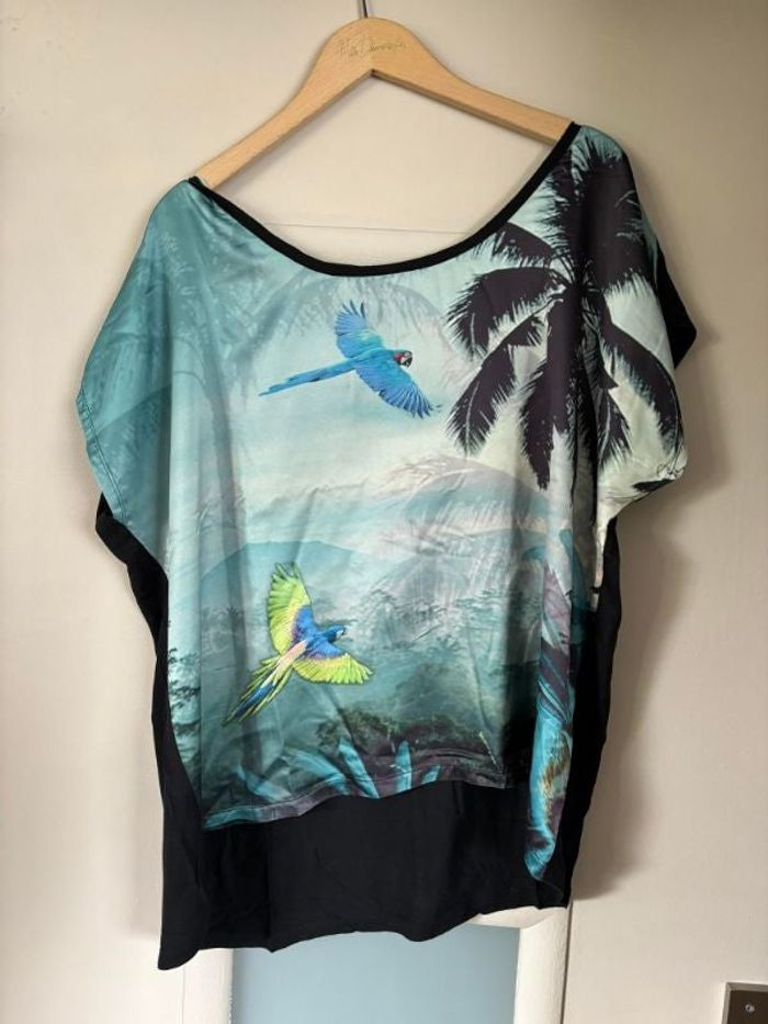 t shirt avec perroquets qui volent et uni noir à l arrière taille XL marque Gémo quelques défauts voir les photos