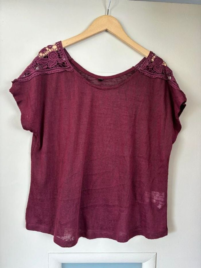 t shirt bordeaux avec de la dentelle au niveau des épaules un peu transparent marque Pimkie taille L