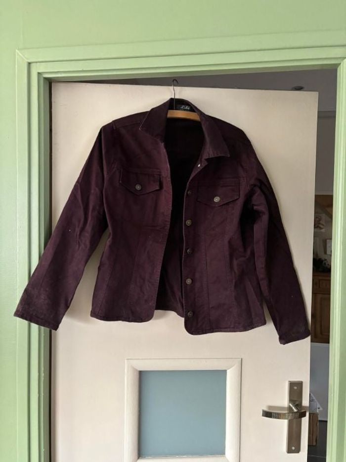 veste en jean bordeaux / violine pas de défaut, il y a juste des poils de chats ce qui peut donner un effet sale mais pas abimé sur la photo 2 ce n'est pas un trou mais l'étiquette taille 42 marque lily of the valley