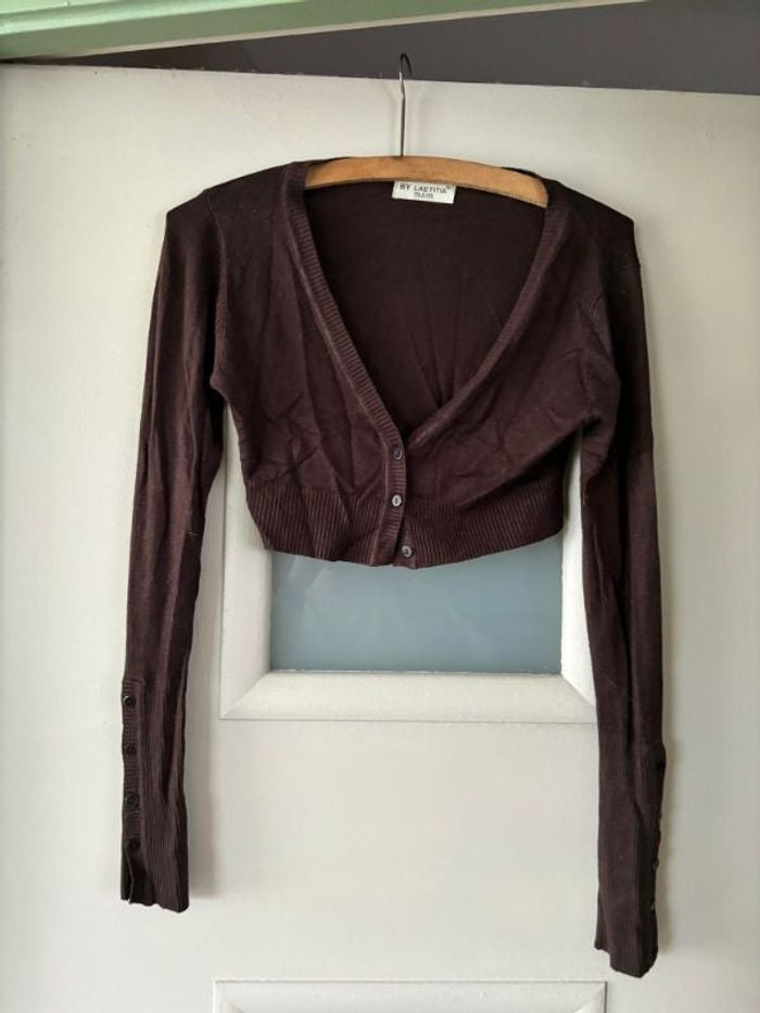 petit gilet marron croc top taille unique il y a un trou en haut du gilet mais je pense qu'on peut facilement le recoudre