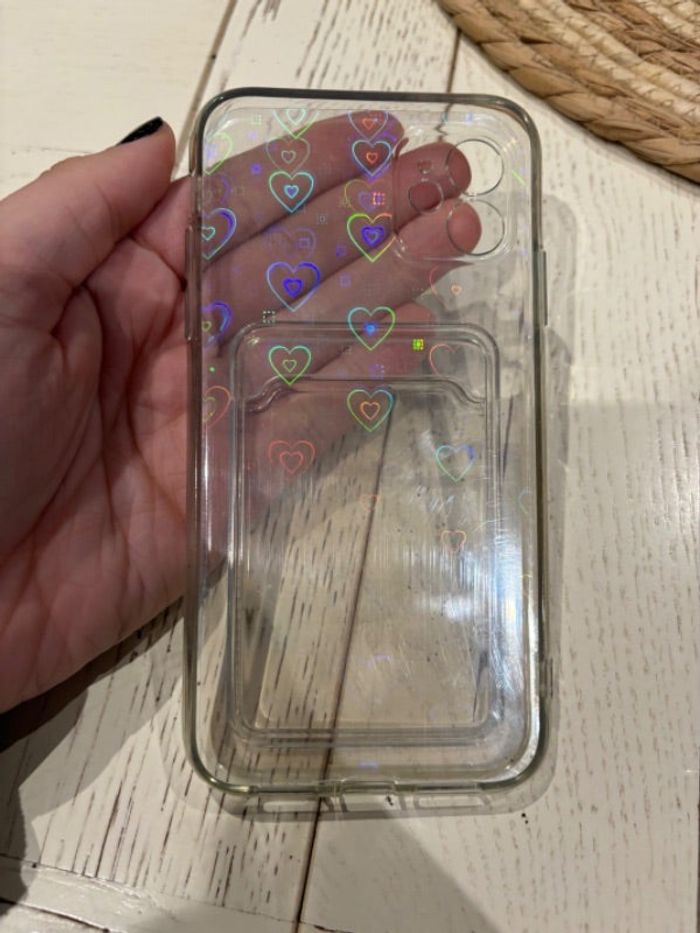 Coque transparente avec un papier à l’intérieur qui fait des petits cœurs en reflet Les petits cœurs ne sont pas sur la coque mais c’est un papier à mettre à l’intérieur (qui est un peu abîmé en bas mais ne se voit pas) Possibilité de mettre une carte ou une photo style Polaroïd (personnellement je mettais mon permis) Pour iPhone 11