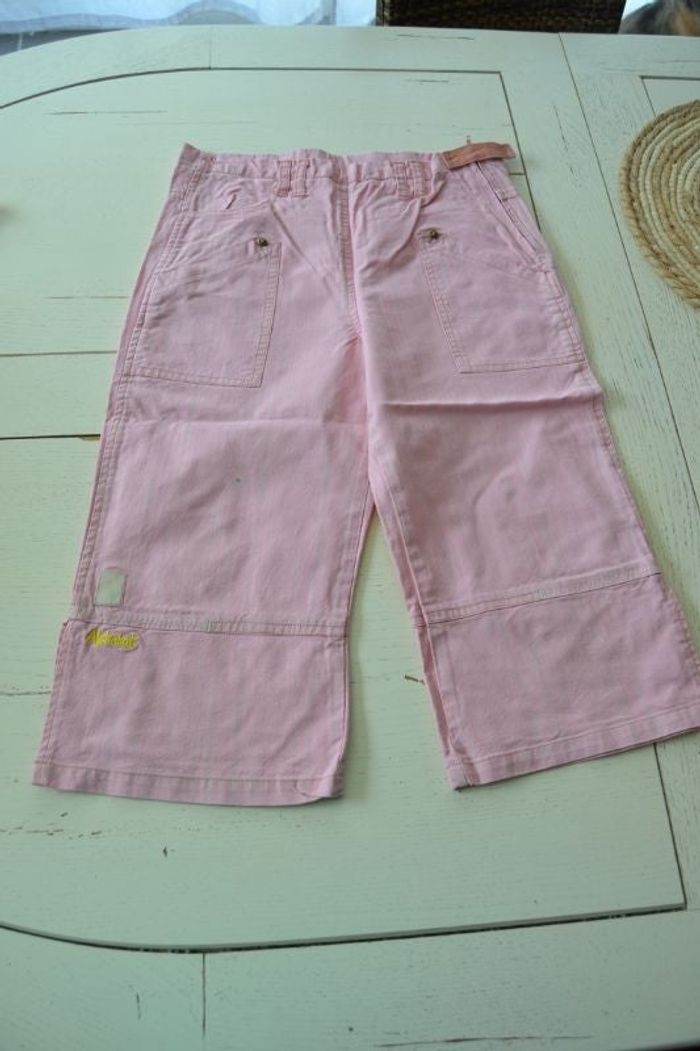 pantalon jeans rose (ou pantacourt) avec ceinture sur le côté et stratch marque alphabet taille 10 ans un peu de crayon voir photo