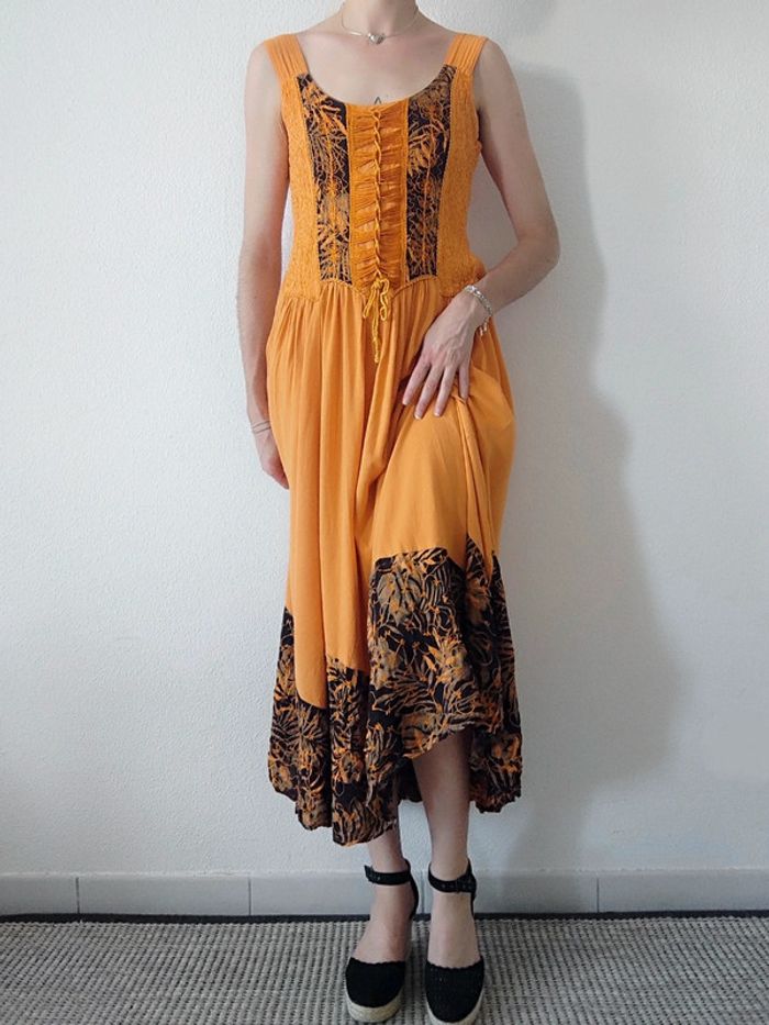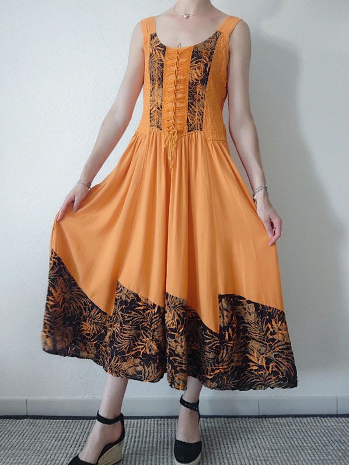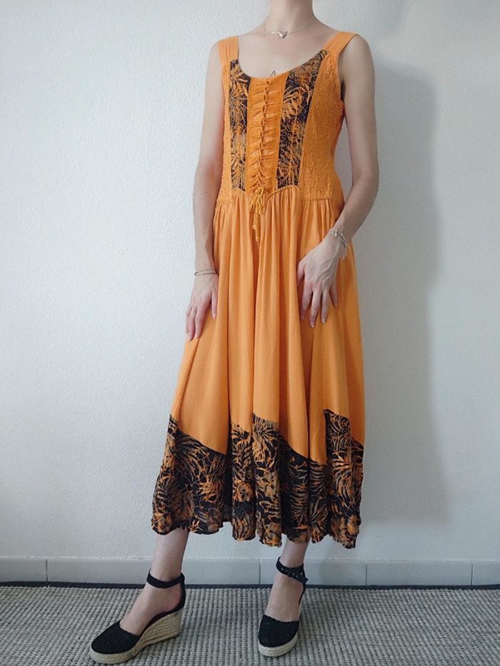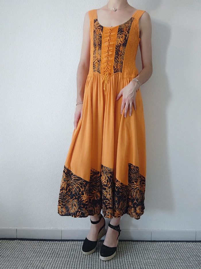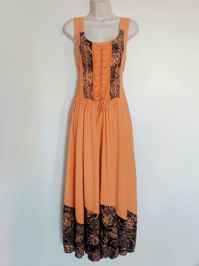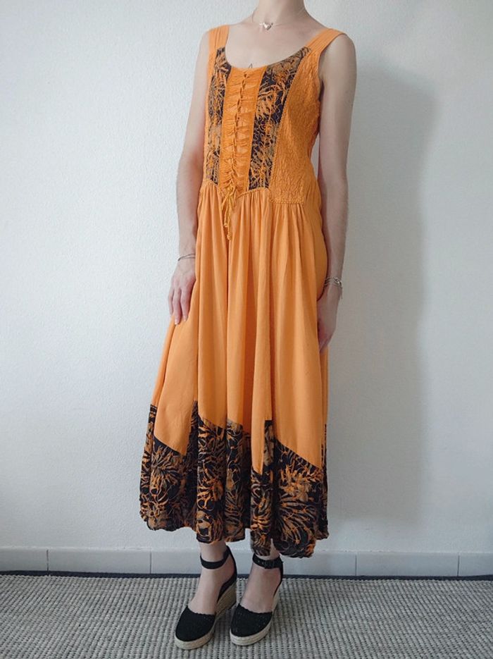 Robe médiévale à lacets orange feuille noir vintage / Coline - 40/L à 42/XL - photo numéro 1