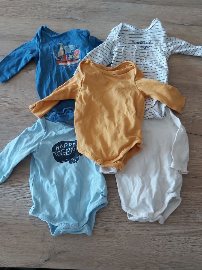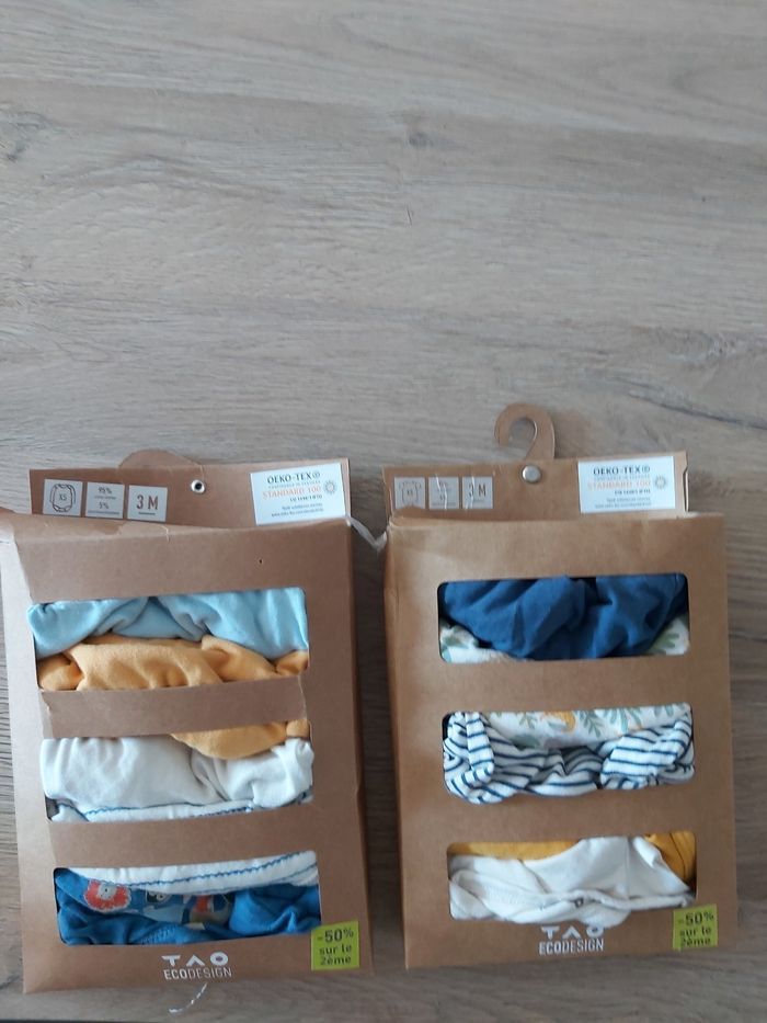 5 bodies manches longues et 5 bodies manches courtes neufs jamais portés (emballage d'origine juste déballé pour la photo). Taille 3 mois
