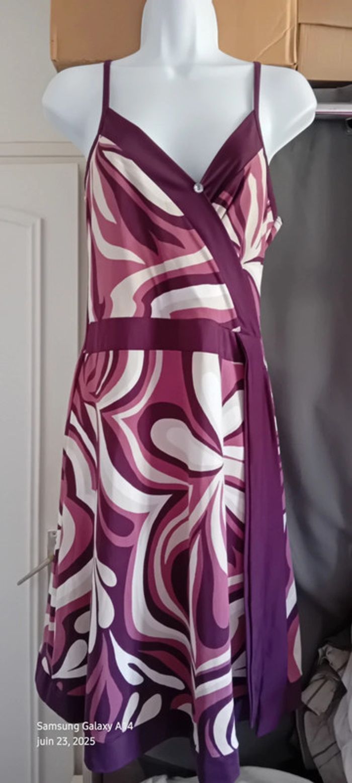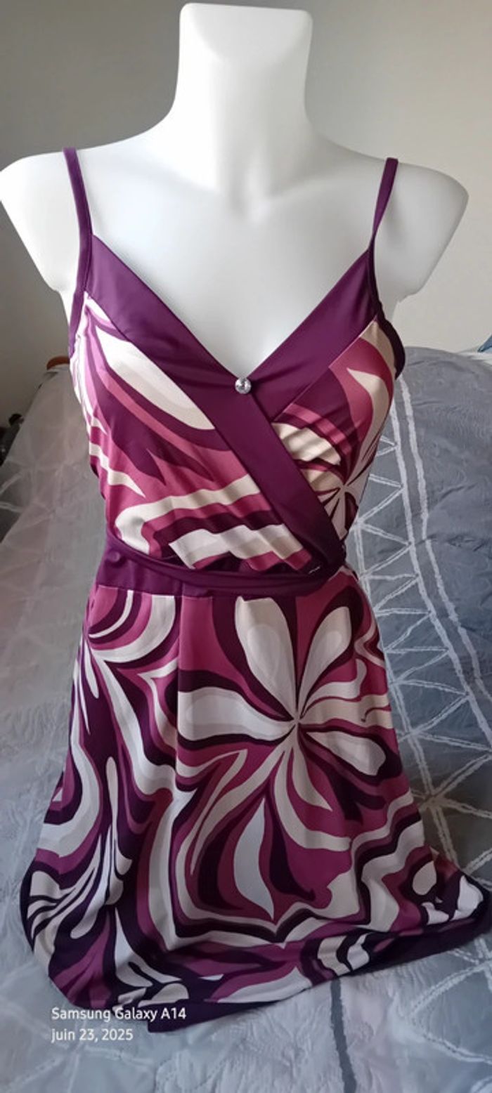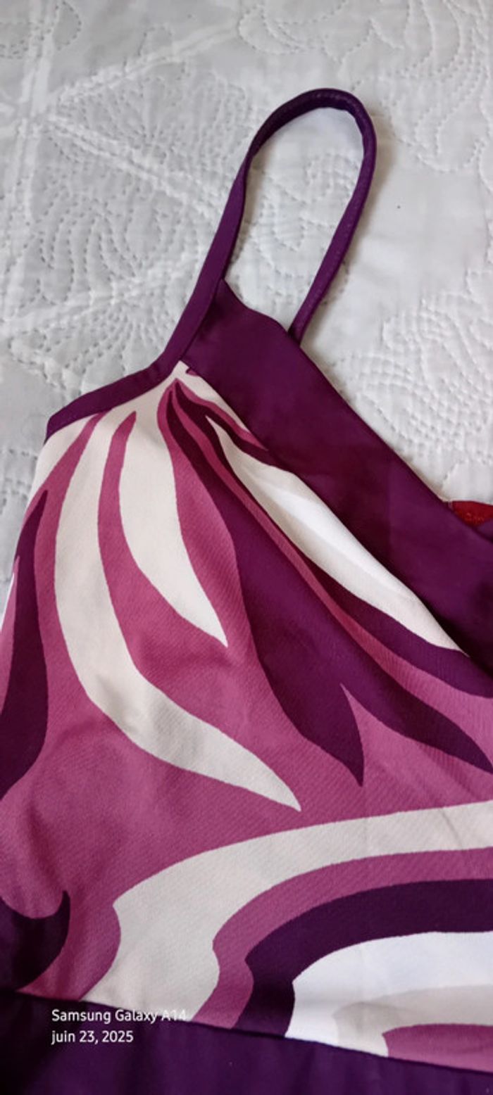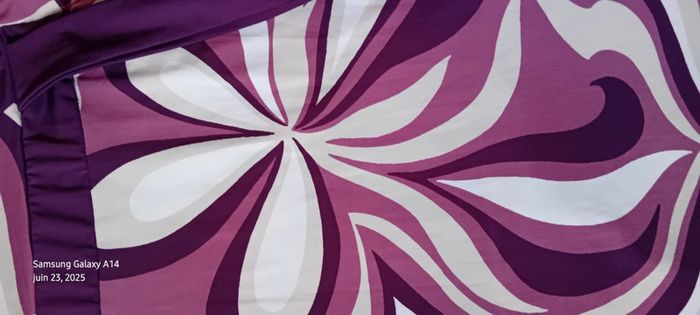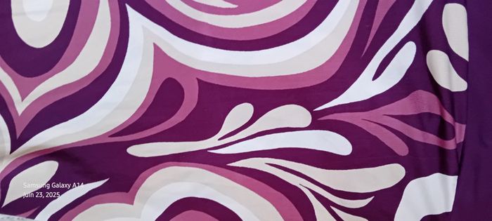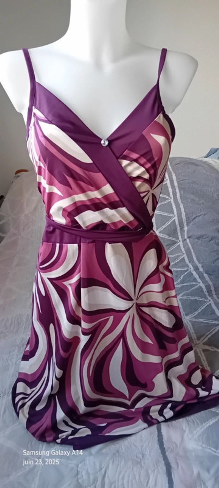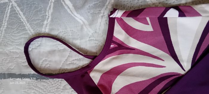 Robe mi longue à fines bretelles en viscose et polyester matière fluide et satinée décolleté cache cœur avec strass coupe trapèze taille haute avec lien motif floral psychédélique style vintage seventies années 70 tons violet prune rose et blanc longueur 97 cm largeur aisselles à aisselles 40 cm tour de taille 70 cm marquée taille L taille petit correspond à un 38/40 en très bon état ⚠️ juste un petit point en bas pas visible àu porté (voir dernières photos) #midole #midolefemme #midolefemme38 #femme38 #robefemme40 #robevintage #robeseventies #robeannees70 #bershka #femme3840 #robecachecoeur #robefinesbretelles38 #robeestivale #motifpsychedelique #motiffloral