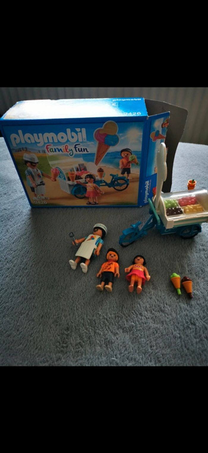 Playmobil 9426 marchand de glace et triporteur coloré. Très bon état mais Manque Les autos collant.