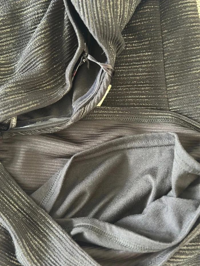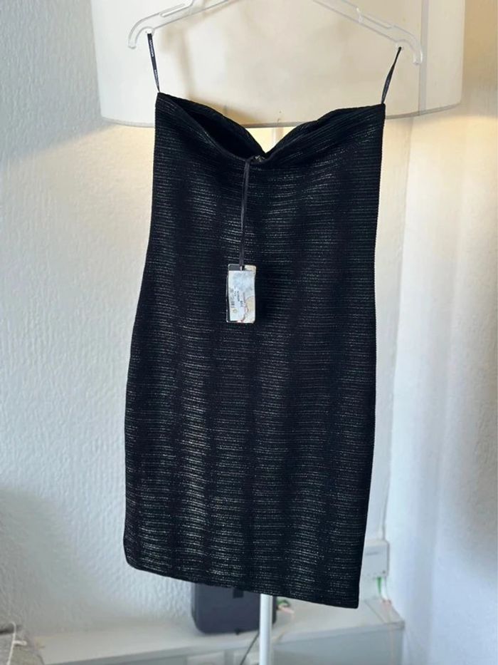 Robe neuve avec étiquette, prix d’achat visible : 65€. Cette robe bustier est très élégante. Elle épouse parfaitement les formes grâce à sa coupe près du corps et sa doublure intégrée. Le noir pailleté ajoute une touche chic sans en faire trop. Le maintien au niveau de la poitrine est bien ajusté, offrant un bon soutien, et la taille XS convient parfaitement. ℹ️ Photo portée générée à titre illustratif, pour vous donner une idée du rendu.