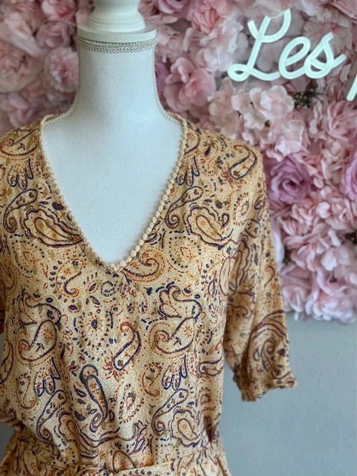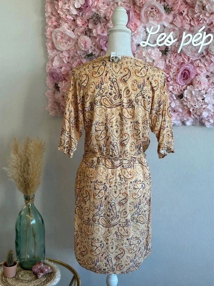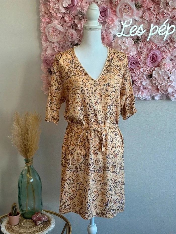 En très bon état. Jolie robe coupe midi, ajustable grâce à un lien ceinture qui peut se porter à l'avant ou à l'arrière. De beaux détails, avec un imprimé cachemire fleuri sur un fond couleur abricot. Col en V, manches 3/4. Mesures : aisselle 50 cm, longueur 87 cm. Elle convient bien à une taille 40 femme.