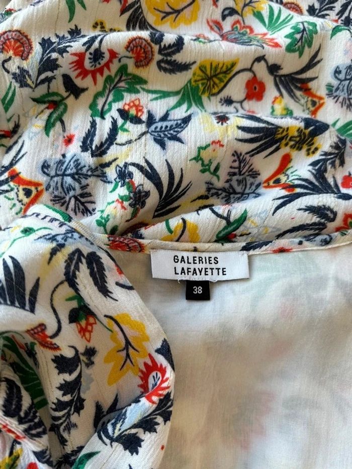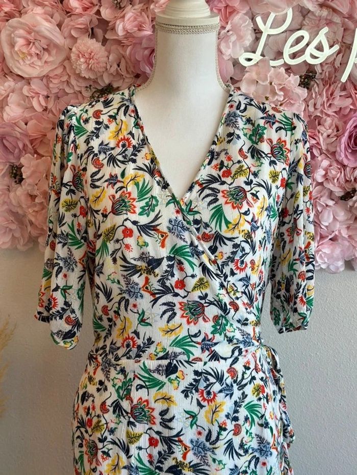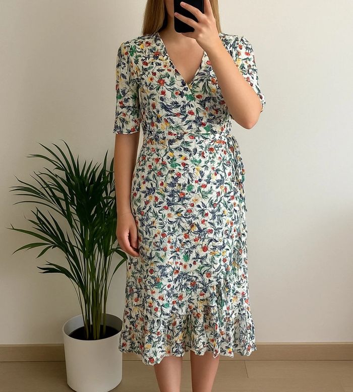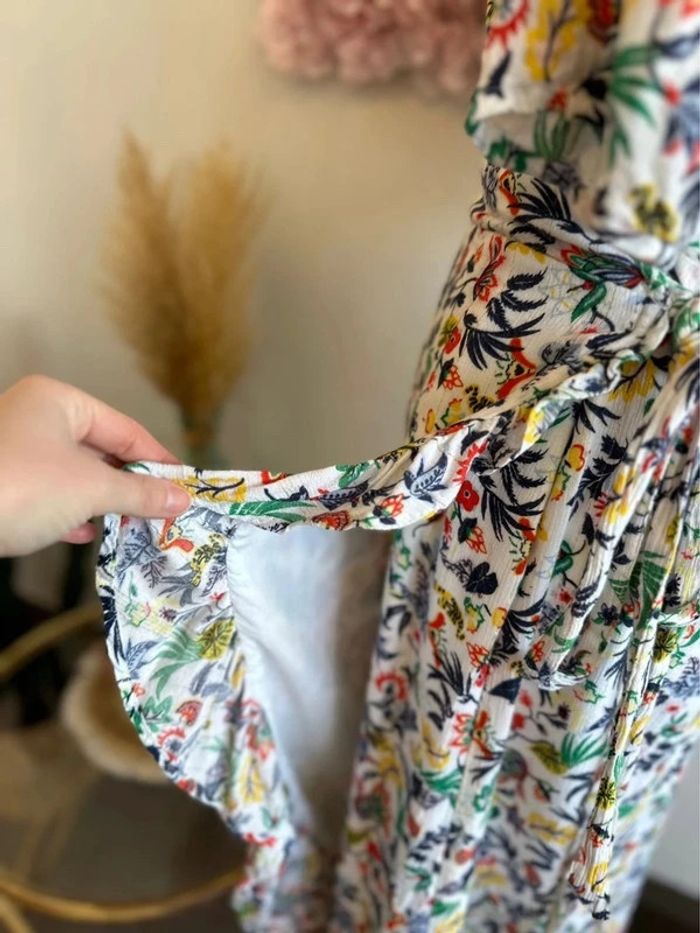 En parfait état, cette ravissante robe portefeuille blanche est ornée de motifs fleuris colorés et de fils lurex dorés, ajoutant une touche de brillance subtile. Ajustable grâce à son lien, elle présente un col façon cache-cœur pour une touche d'élégance supplémentaire. Fabriquée en viscose et doublée pour un confort optimal. Longueur totale de 130 cm. La taille 38 convient bien. Prix d'achat initial : 79,99 €. ℹ️ Photo portée générée à titre illustratif, pour vous donner une idée du rendu.