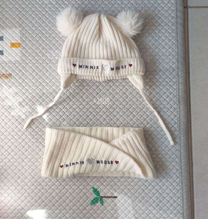 Bonnet et tour de cou Minnie mousse. Le bonnet peut s'accrocher sous le menton. Pompon sur le dessus. Tour de tête 45. #Steph85690_bonnetecharpe