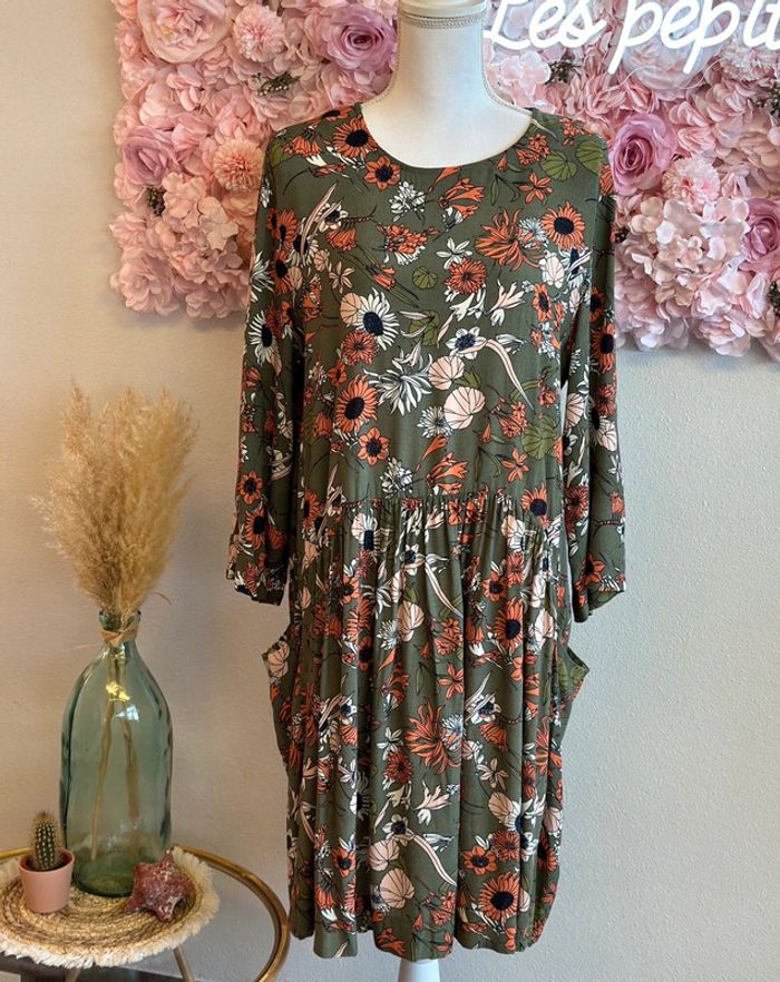 Robe d’été fluide et légère de couleur kaki. En viscose. Motifs fleuris dans des tons kaki, orangé, rosé et écru. Col rond. La taille 44 convient bien. Longueur 95 cm, aisselle 55 cm. Elle est en excellent état. ℹ️ Photo portée générée à titre illustratif, pour vous donner une idée du rendu.