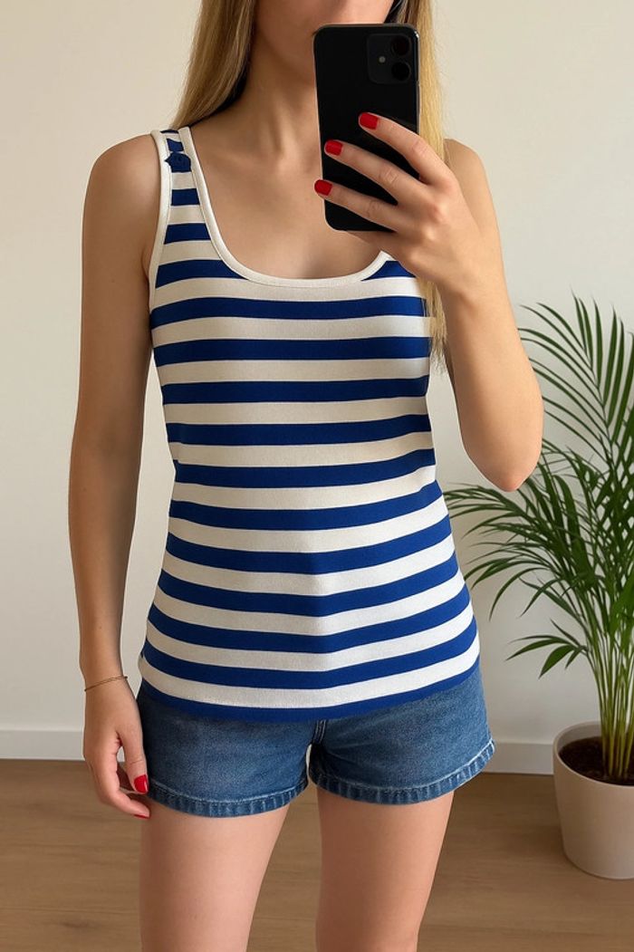 Débardeur marinière signé Maison 123, en maille douce et stretch. Joli contraste de rayures bleu marine et blanc, col rond, bouton fantaisie à l’épaule. Mélange coton/modal très agréable à porter. Coupe près du corps sans être moulante. En très bon état, aucune trace d’usure. Taille indiquée 38/40, convient parfaitement pour un M. Mesures à plat : aisselle à aisselle 50 cm, longueur totale 55 cm. Composition : 50% coton, 50% modal. ℹ️ Photo portée générée à titre illustratif, pour vous donner une idée du rendu.