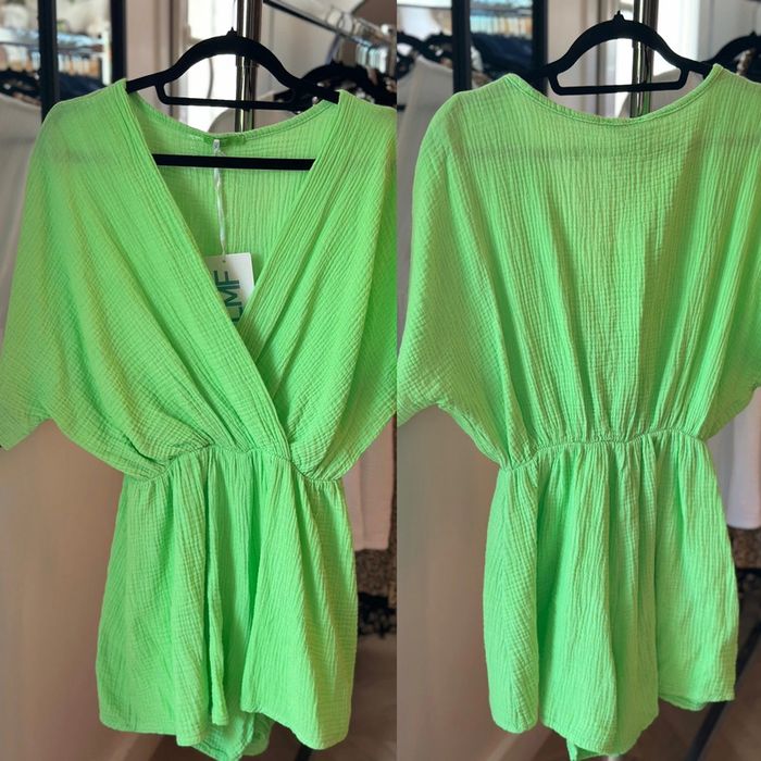 Combi short oversize vert en gaz de coton, décolleté croisés, élastique à la taille. (Vendue sans la ceinture) • Dimension - longueur 77cm, taille élastique. • Composition - 100% coton - Fabriqué en Italie. Une combinaison qui complètera parfaitement votre style. Sa matière haut de gamme vous offrira confort et praticité. Elle s'accordera parfaitement avec tous vos looks du quotidien, tout en restant élégante. Ce modèle est indispensable à votre garde-robe ! Convient du XS au XL.