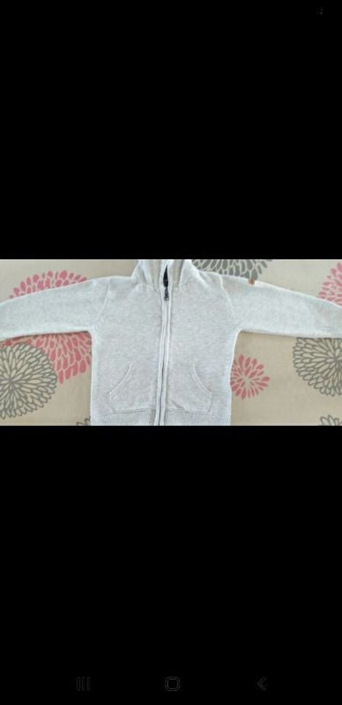Gilet gris avec capuche et poches sur les côtés.