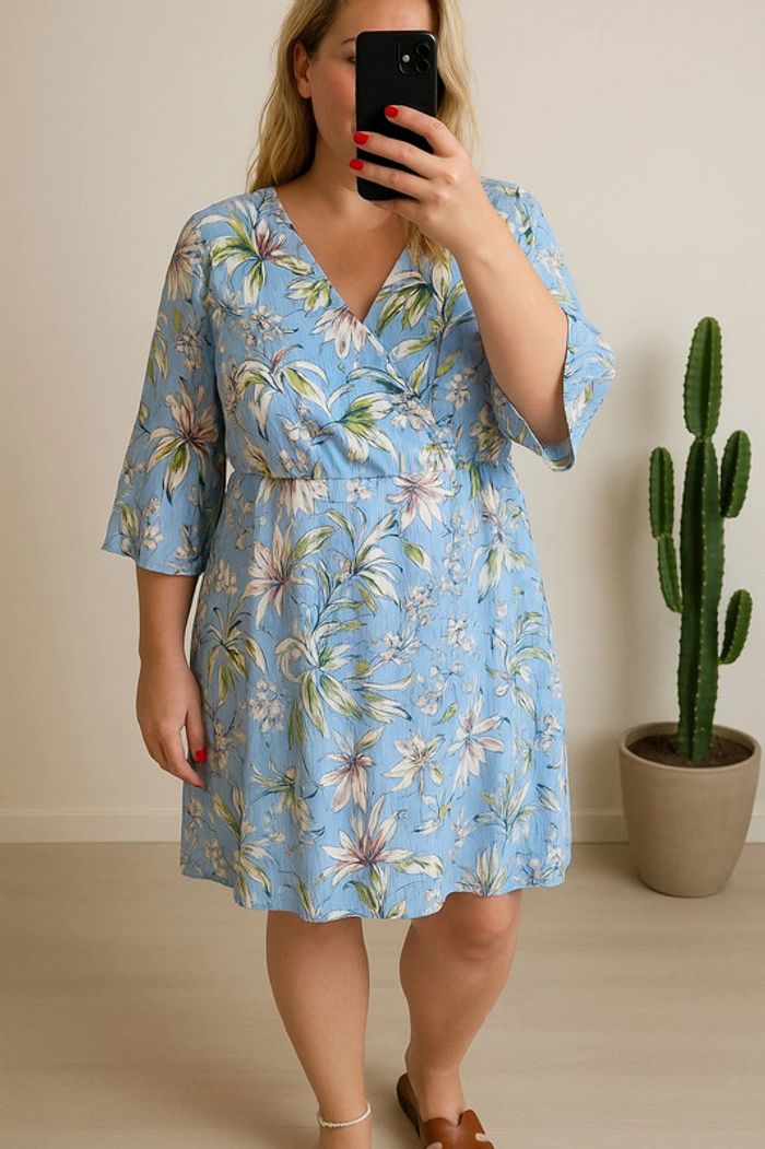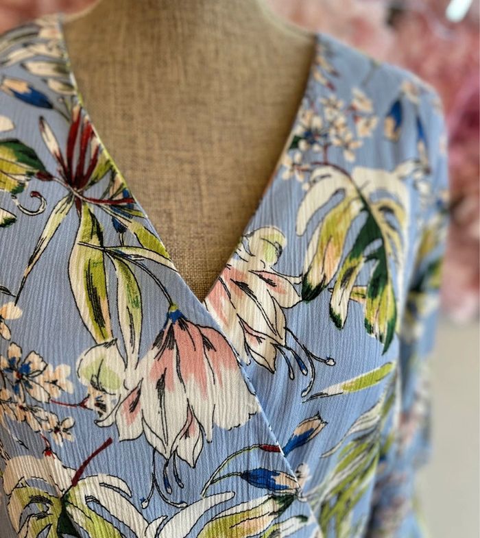 En parfait état, cette ravissante robe bleu clair à motifs fleuris présente un col cache-cœur et des manches 3/4. Elle se ferme au dos pour un ajustement parfait. La taille 42 convient parfaitement, ok pour un 40/42. • Largeur d’aisselle à aisselle : 52 cm • Longueur : 100 cm • Largeur des épaules : 42 cm. ℹ️ Photo portée générée à titre illustratif, pour vous donner une idée du rendu.