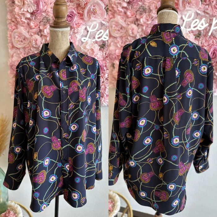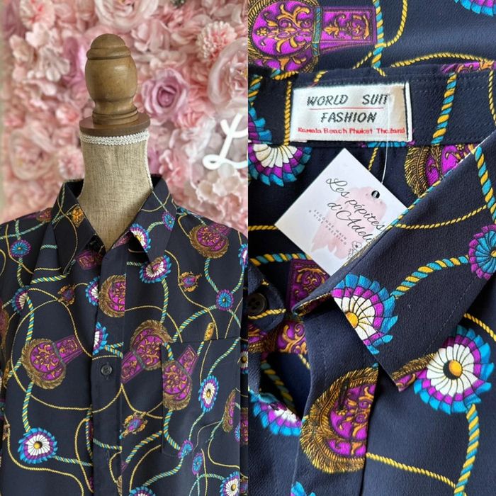 En excellent état, cette magnifique chemise à motifs vintage est un véritable trésor. Avec sa fermeture à boutons et sa marque World Suit Fashion, elle offre un charme rétro indéniable. Fabriquée en Thaïlande, elle est également dotée d'une étiquette "Made in Thaïlande". Cette chemise convient parfaitement jusqu’à une taille 48, peut être portée de manière oversize pour une taille plus petite. - Longueur : 78cm - Aisselle à aisselle : 63cm - Épaule à épaule : 46cm - Longueur des bras : 61cm - Diamètre haut du bras : 24cm ℹ️ Photo portée générée à titre illustratif, pour vous donner une idée du rendu.