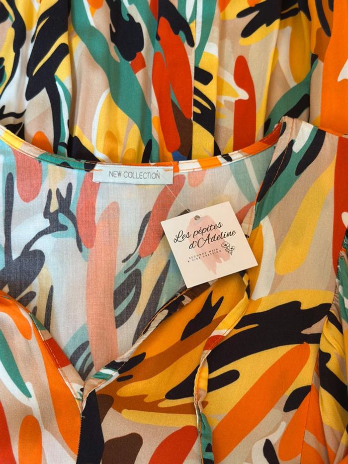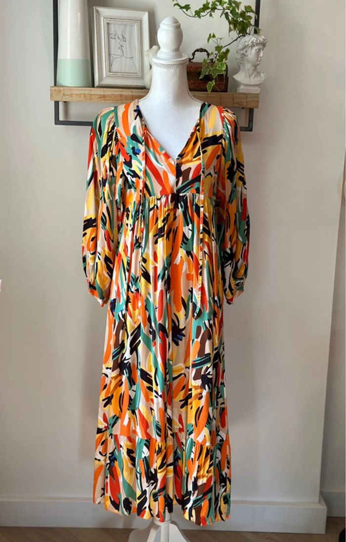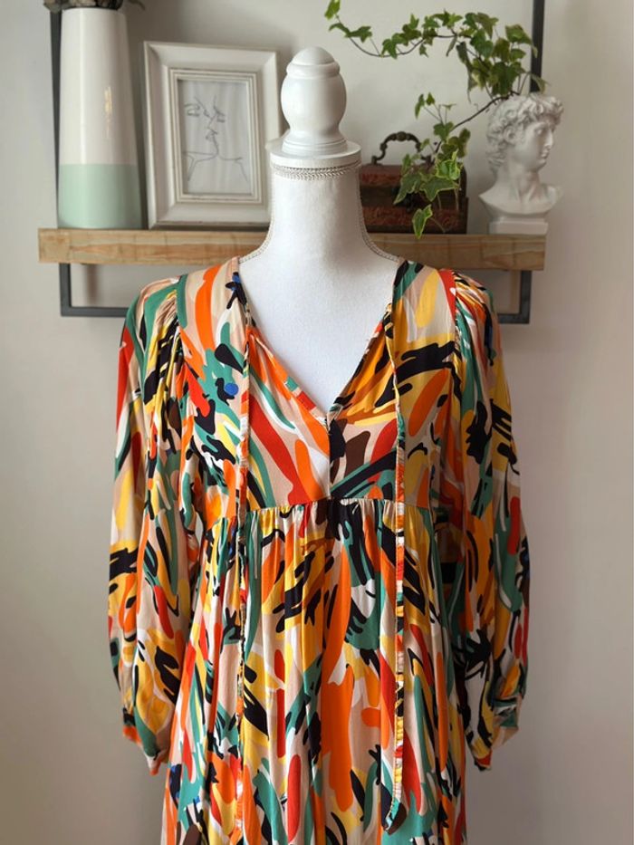 Robe midi fluide à imprimé coloré orange, vert, noir et beige, avec encolure en V et petits liens à nouer. Coupe ample sous la poitrine, manches longues légèrement bouffantes et bas volanté. Longueur 120 cm, largeur à plat sous les aisselles 45 cm. Confectionnée en 100 % viscose, agréable à porter. Taille unique qui convient parfaitement à un 36/38 pour un tombé légèrement oversize. Très bon état. ℹ️ Photo portée générée à titre illustratif, pour vous donner une idée du rendu.