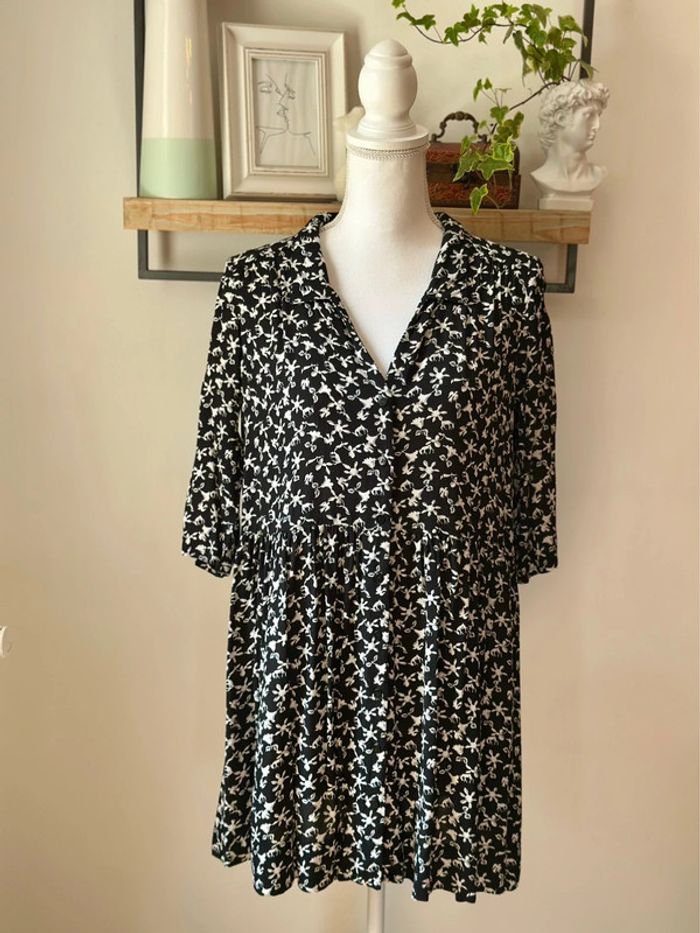 Robe courte Ba&sh à imprimé floral écru sur fond noir, coupe fluide avec col V boutonné, manches trois-quarts et taille légèrement froncée. Tissu 100 % viscose, agréable à porter et léger. Longueur environ 85 cm, taille XS/34 (convient pour un petit 34/36 selon les morphologies). Très bon état, aucun défaut à signaler. ℹ️ Photo portée générée à titre illustratif, pour vous donner une idée du rendu.