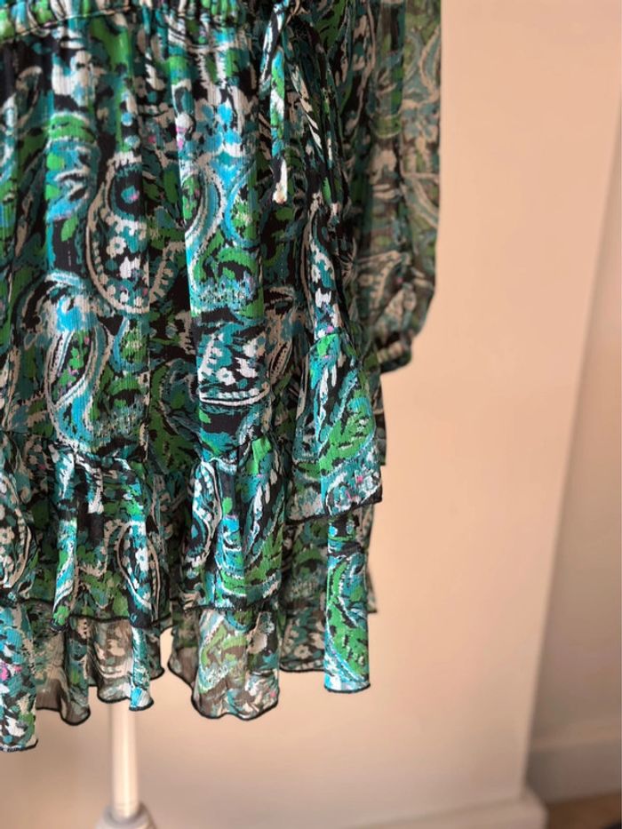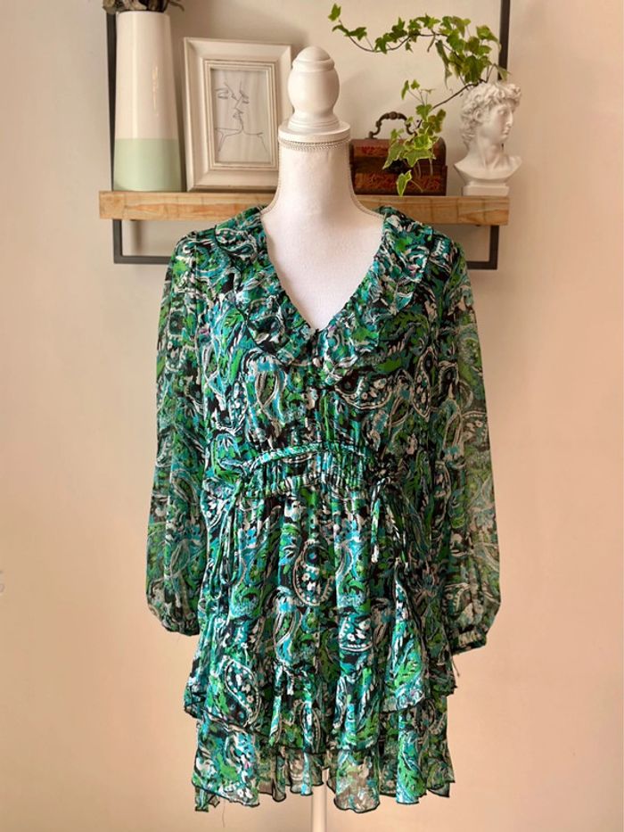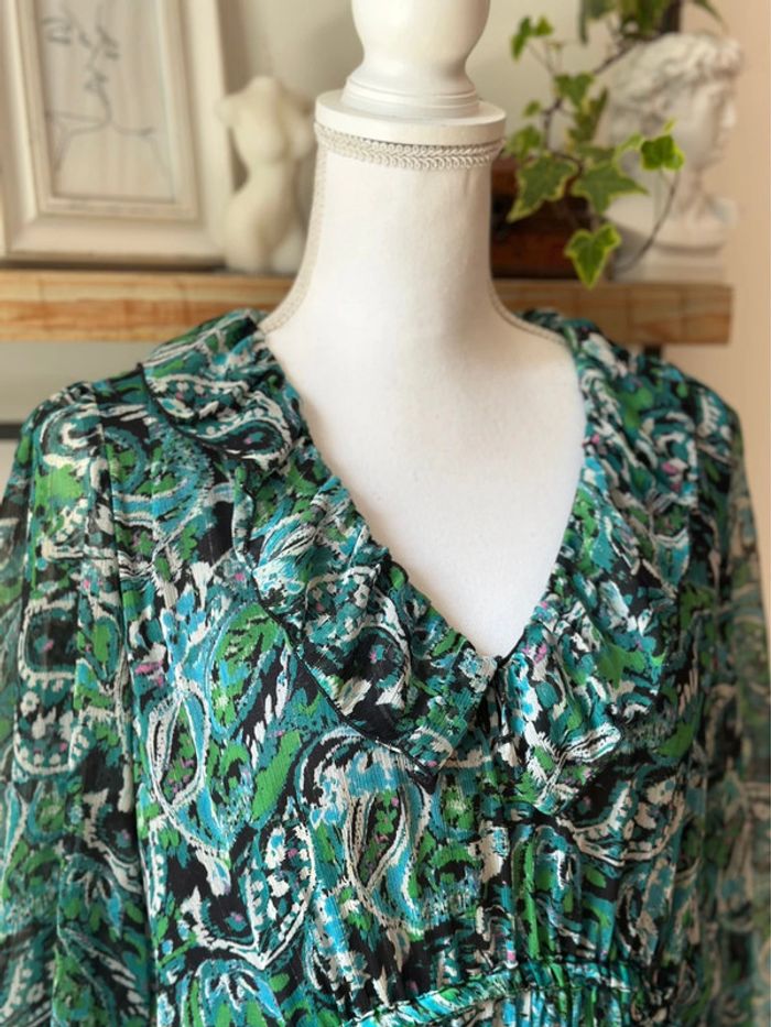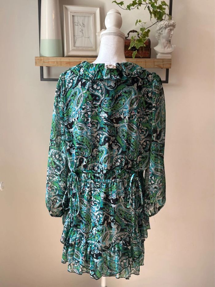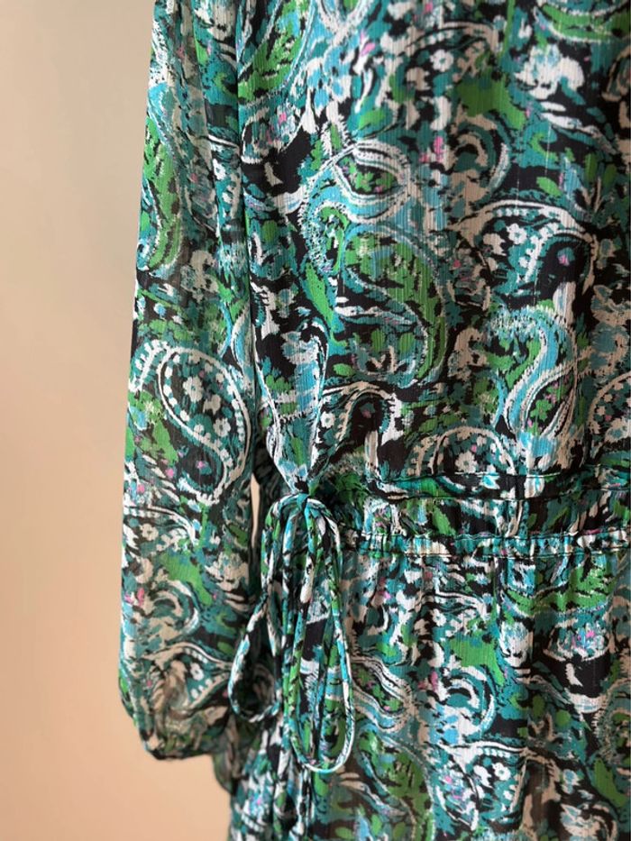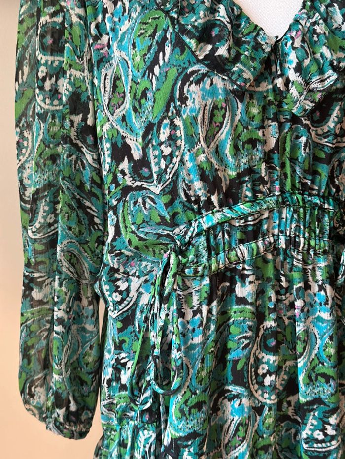 Robe fluide courte à imprimé cachemire dans les tons verts, bleus et noirs, avec volants, col en V et manches longues légèrement transparentes. Coupe féminine et confortable, taille marquée avec lien ajustable. Tissu léger, doublé, parfait pour un look chic ou décontracté. Largeur aisselle à aisselle : 50 cm. Taille L, convient bien à un 40. Très bon état, aucun défaut à signaler. ℹ️ Photo portée générée à titre illustratif, pour vous donner une idée du rendu.