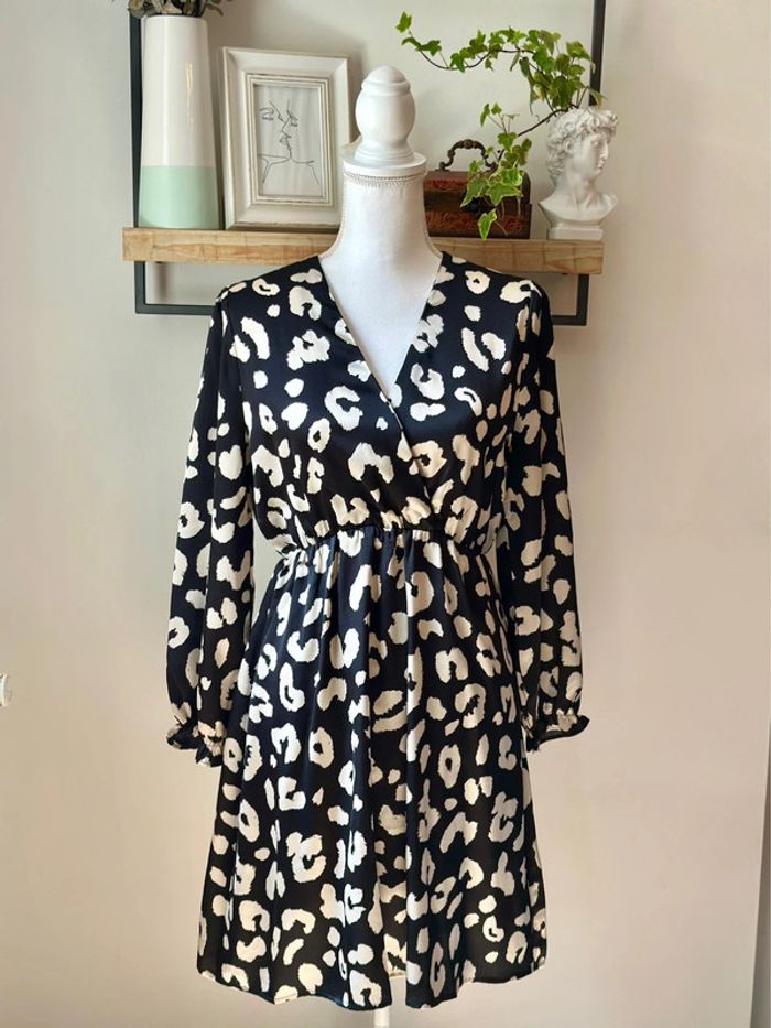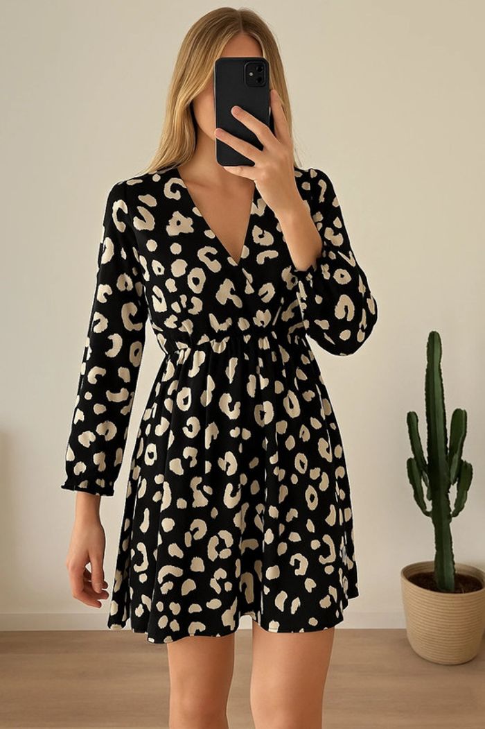 Robe fluide à manches longues avec imprimé léopard noir et blanc, coupe patineuse avec taille élastique et décolleté en V croisé. Marque Lili & Lala, taille S. Tissu léger et agréable, idéale pour un look chic et décontracté. Article neuf avec étiquette encore attachée. ℹ️ Photo portée générée à titre illustratif, pour vous donner une idée du rendu.