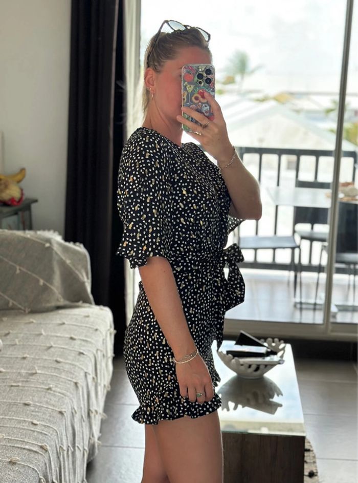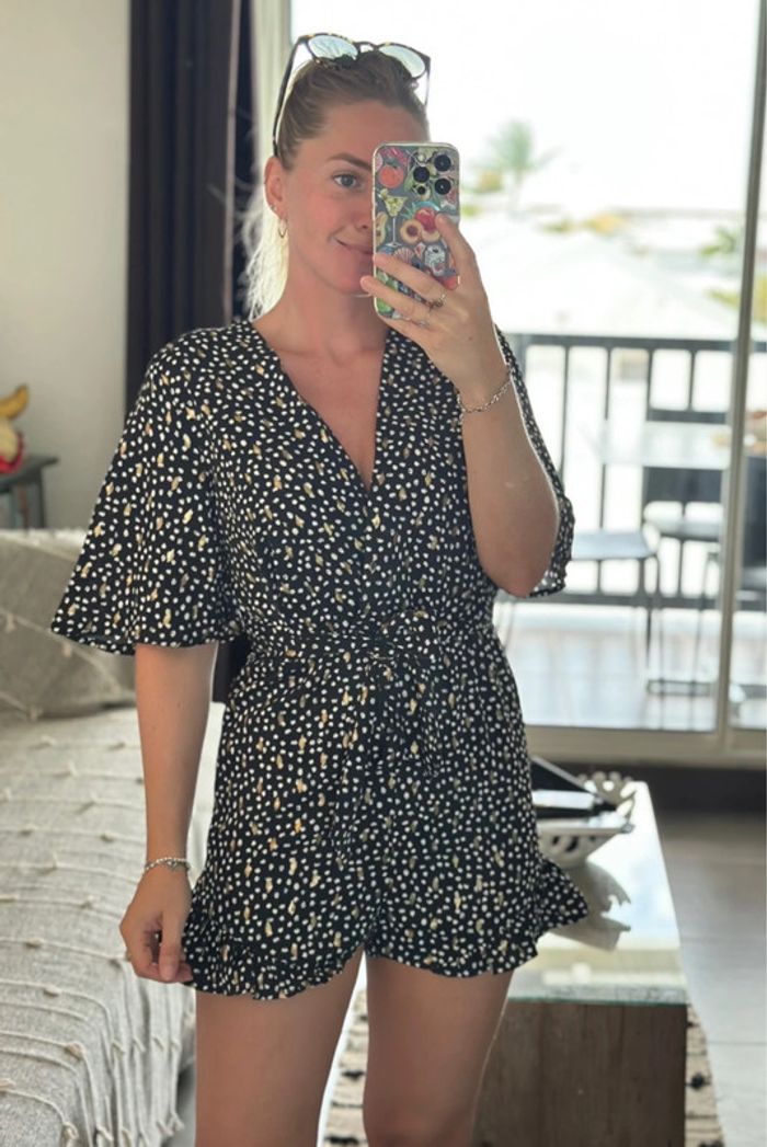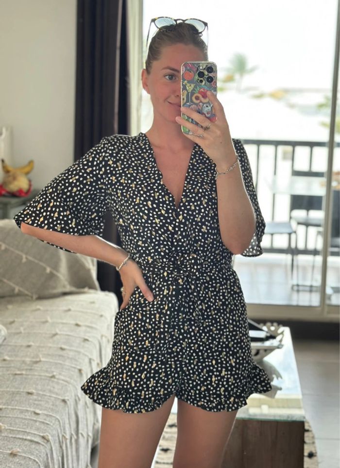 Joli combishort noir à motifs blancs et dorés, parfait pour un look chic et décontracté. Décolleté en V, manches amples et volant au bas pour une touche féminine. • Taille indiquée : M, mais convient parfaitement à un XS • Neuf avec étiquette, jamais porté • Fermeture zippée au dos • Le lien a été noué devant sur les photos, mais peut aussi se porter dans le dos selon le style souhaité • Tissu fluide et léger, super agréable à porter Un petit bijou de combi, parfait pour le printemps/été ou une soirée stylée ! 📏 Je mesure 1m60, 47-48kg, t34,36, p36 Plus d’infos dans ma description de profil. 🔥 Code promo pour les abonnées Insta @les_pepitesdadeline ❌ Pas de remises sans code promo ⚜️ Forme un lot et bénéficie d’une remise • Trois articles -5% • Cinq articles -10% Cumulables avec le code promo 🔥 💌 N’hésite pas à t’abonner si tu souhaites être la première avertie des prochaines pépites & suis la boutique sur instagram pour ne rien louper.