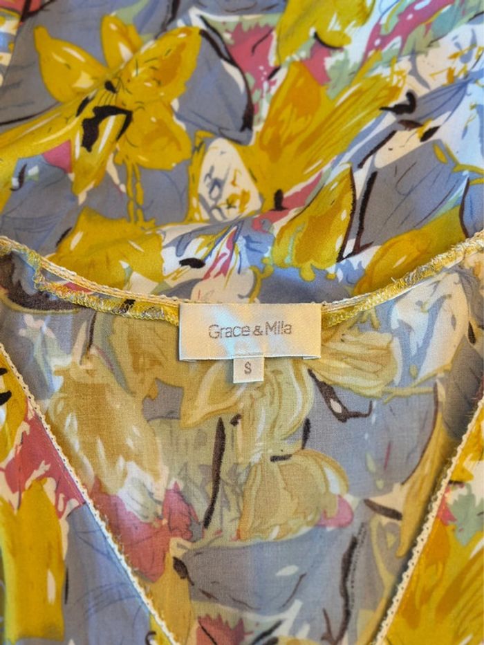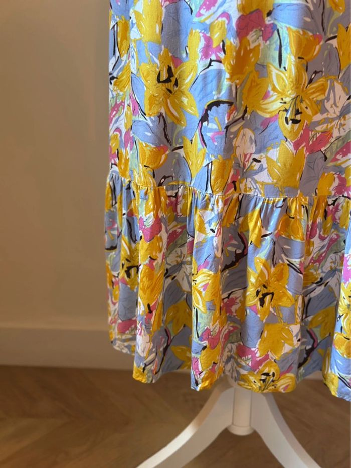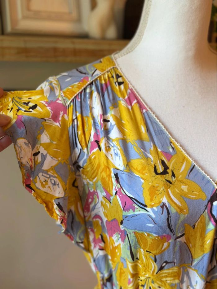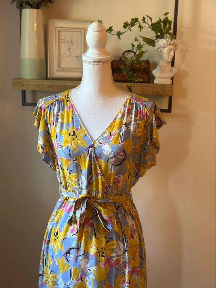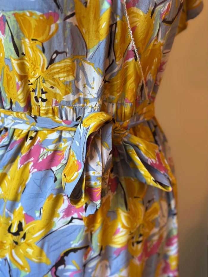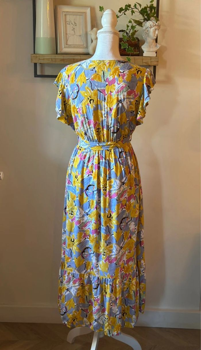 Robe midi à manches courtes volantées et encolure cache-cœur. Motif fleuri coloré dans les tons jaune, bleu, rose et blanc (voir photos). Lien ajustable à la taille pour souligner la silhouette. Longueur environ 125 cm. Matière fluide et légère, 100 % viscose. Très bon état, aucun défaut. Taille S, coupe fidèle, convient parfaitement à un 36. ℹ️ Photo portée générée à titre illustratif, pour vous donner une idée du rendu.