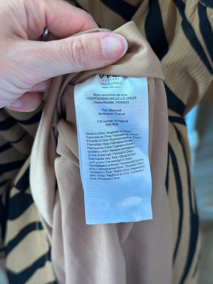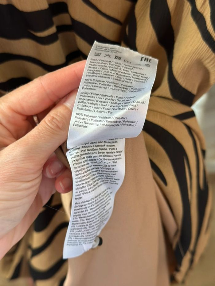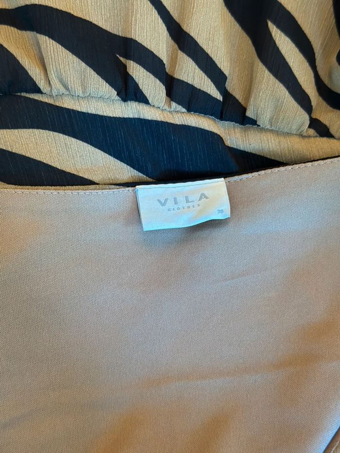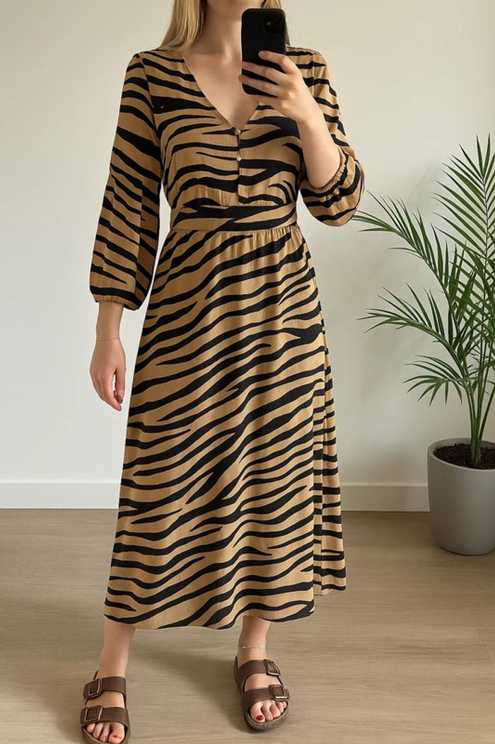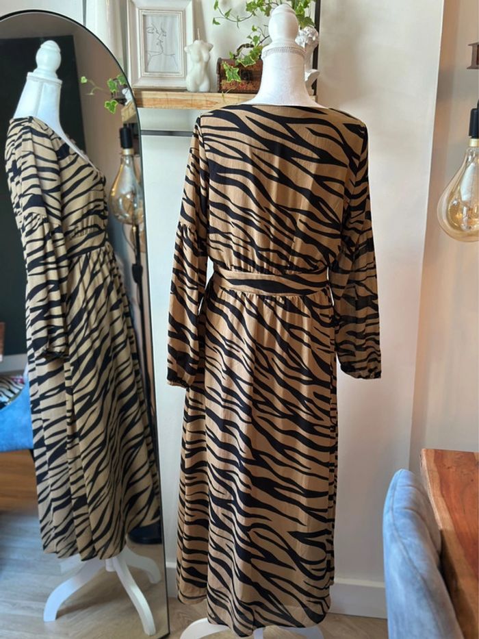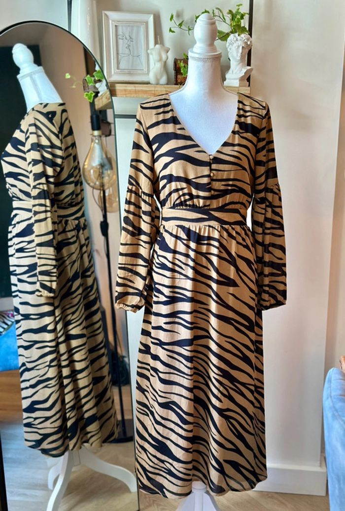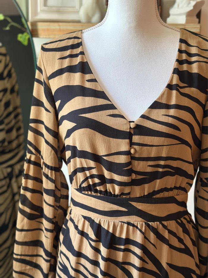 Robe midi fluide à l’imprimé zébré camel/noir de la marque Vila, en taille 38. Coupe flatteuse et cintrée à la taille, col V, manches longues légèrement bouffantes et petits boutons sur le buste. La longueur (125 cm). Entièrement doublée, matière agréable, très peu froissable. État impeccable, portée une seule fois. Composition : 100% polyester (doublure également en polyester). Idéale pour un look chic et confortable, à porter avec des sandales en été ou des bottes à la mi-saison ! ℹ️ Photo portée générée à titre illustratif, pour vous donner une idée du rendu.