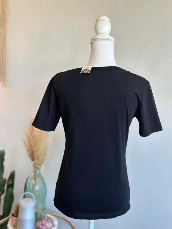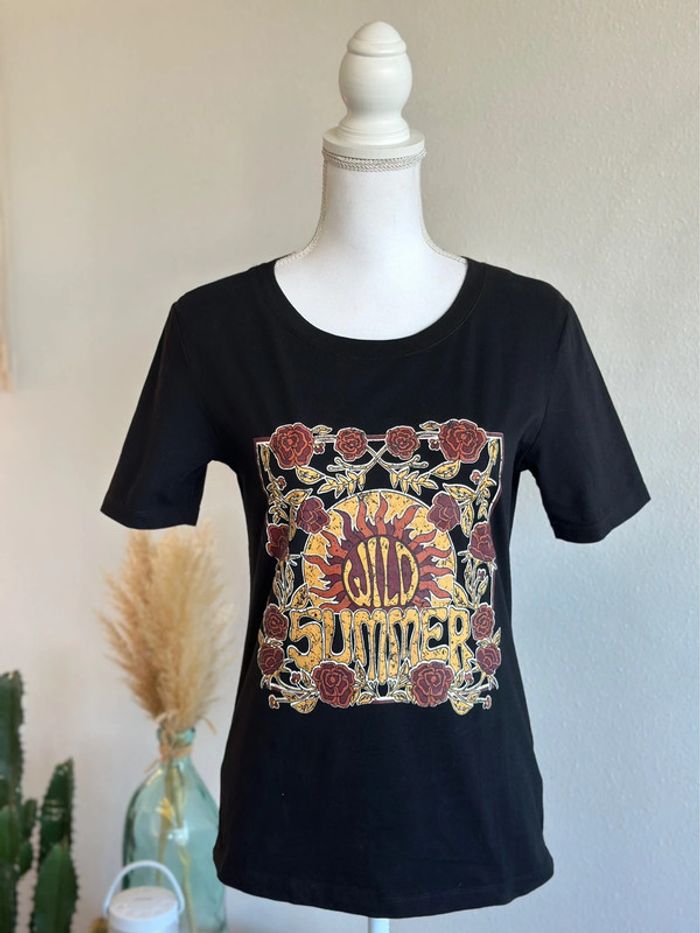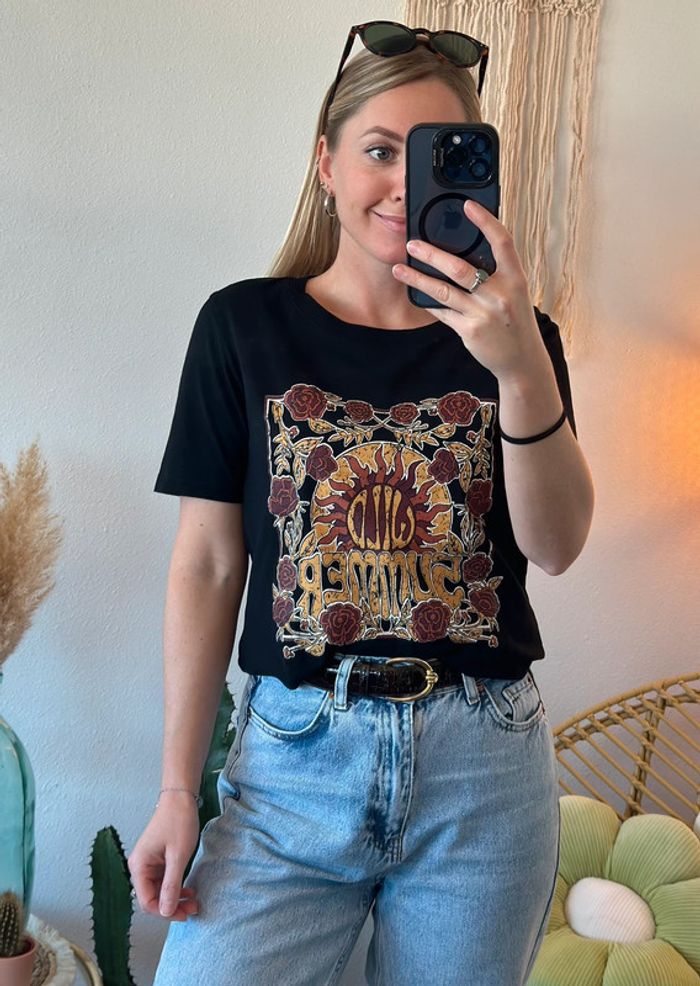 T-shirt noir à manches courtes et col rond, en excellent état. L’imprimé “Wild Summer” est orné de fleurs dans des tons de jaune, orange et bordeaux. La taille S convient parfaitement. L’étiquette de composition a été retirée pour plus de confort, car elle était gênante. 📏 Je mesure 1m60, 47-48kg, t34,36, p36 🔥 Code promo pour les abonnées Insta @les_pepitesdadeline ❌ Pas de remises sans code promo ⚜️ Forme un lot et bénéficie d’une remise • Trois articles -5% • Cinq articles -10% Cumulables avec le code promo 🔥 💌 N’hésite pas à t’abonner si tu souhaites être la première avertie des prochaines pépites & suis la boutique sur instagram pour ne rien louper.