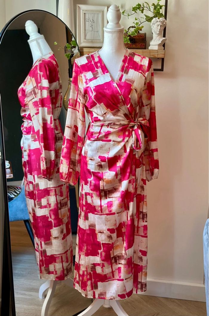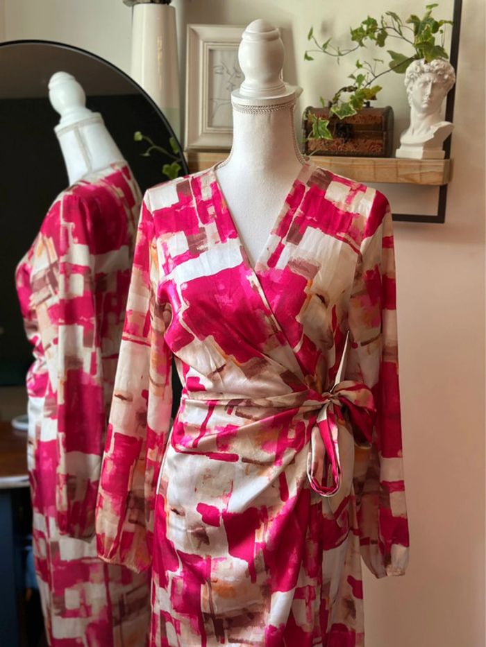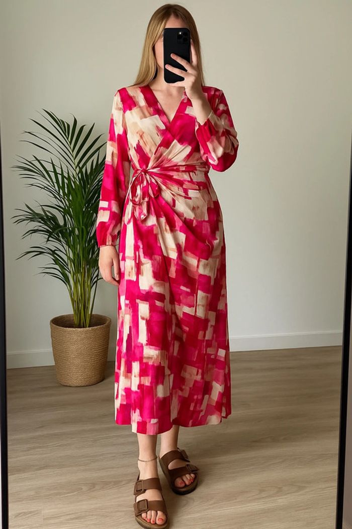 Robe longue portefeuille à nouer, manches longues légèrement bouffantes, col en V croisé et coupe ajustable à la taille. Imprimé abstrait dans les tons rose, beige et fuchsia sur fond blanc. Tissu fluide en 100 % polyester, agréable à porter et au tombé léger. Style féminin et chic, parfait pour la mi-saison ou l’été. Très bon état, longueur 130cm, convient du 36 au 40. ℹ️ Photo portée générée à titre illustratif, pour vous donner une idée du rendu.