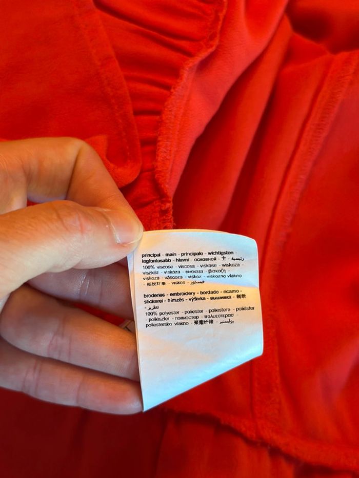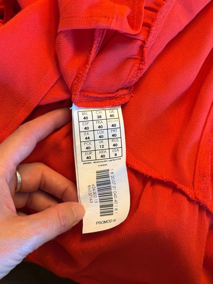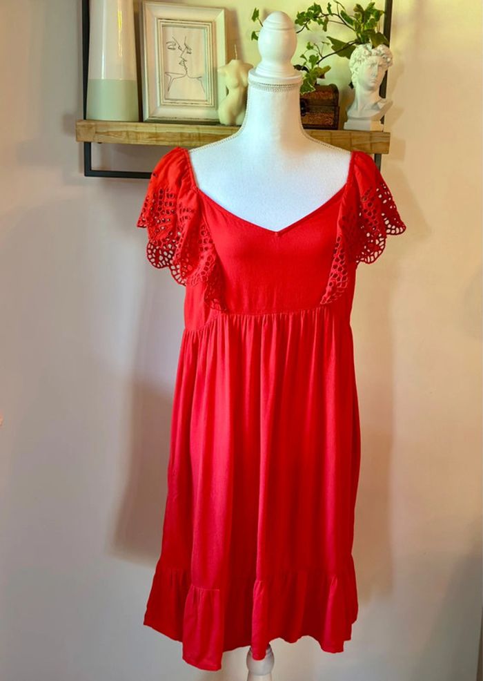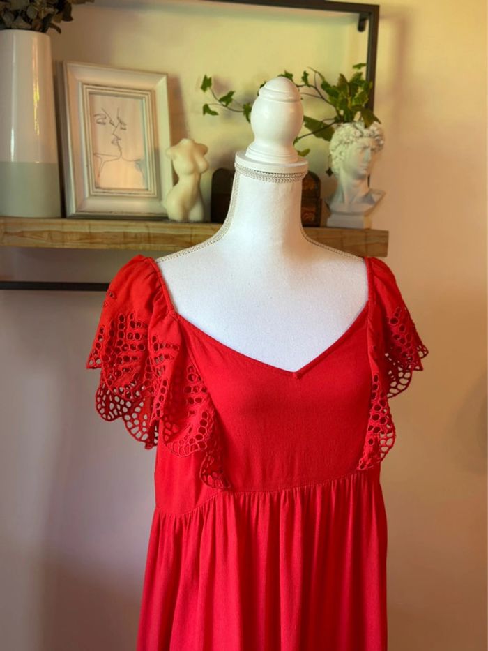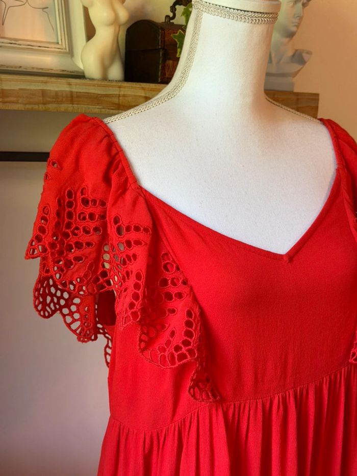 Robe rouge d’été en viscose, coupe babydoll fluide et féminine, avec jolis détails en dentelle. Taille 40, coupe confortable qui taille bien. Parfait état, très peu portée. Prix d’achat 39,99 €. 📏 Aisselle à aisselle : 50 cm – Longueur : 95 cm. Composition : 100 % viscose. ℹ️ Photo portée générée à titre illustratif, pour vous donner une idée du rendu.