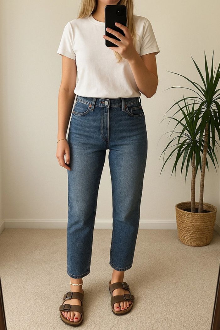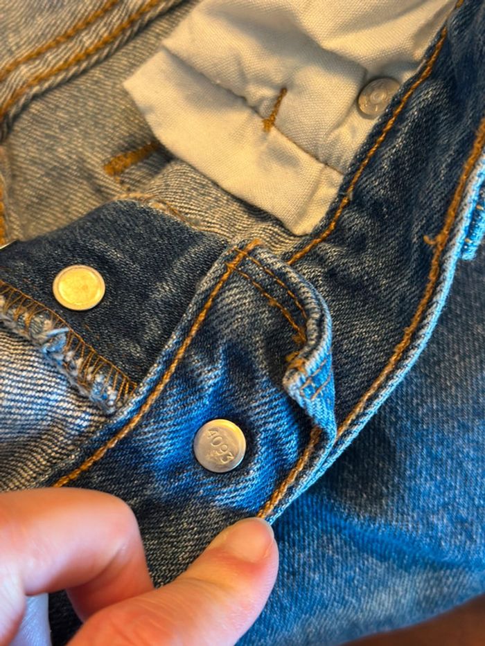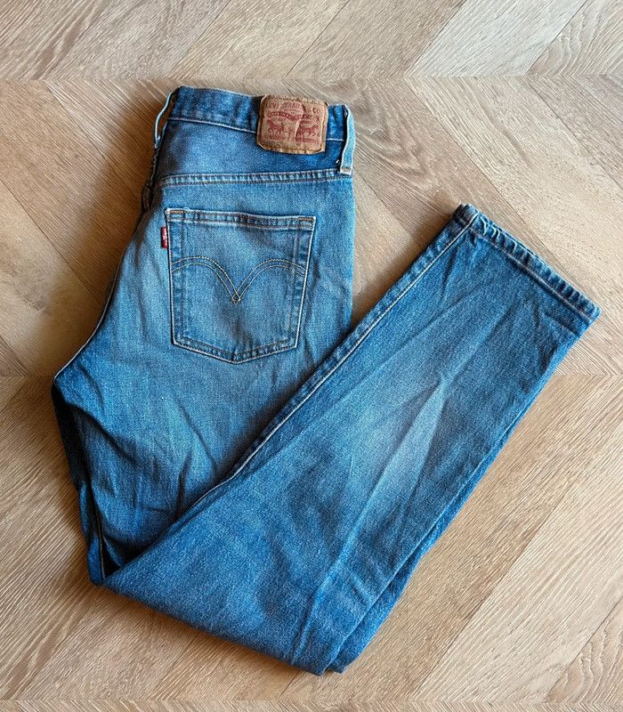 Jean Levi’s 501 CT à la coupe droite légèrement fuselée, taille haute, avec fermeture à boutons. Modèle revisité du 501 classique pour une silhouette plus affinée et moderne. Délavage bleu moyen, toile en denim de qualité (99 % coton, 1 % élasthanne) : souple mais avec une bonne tenue. Confortable et flatteur, il convient parfaitement à une taille 34 ou un petit 36. Très bon état, sans défaut visible. 📏 Mesures à plat : • Largeur taille : 38 cm • Longueur totale : 95 cm • Largeur bas de jambe : 18 cm ℹ️ Photo portée générée à titre illustratif, pour vous donner une idée du rendu.