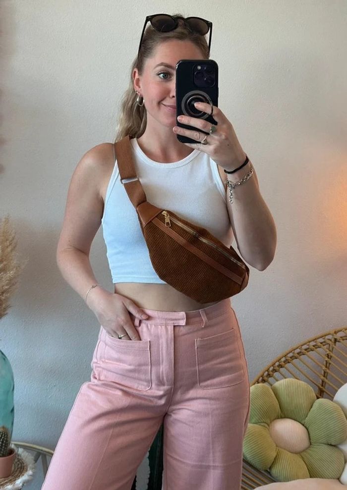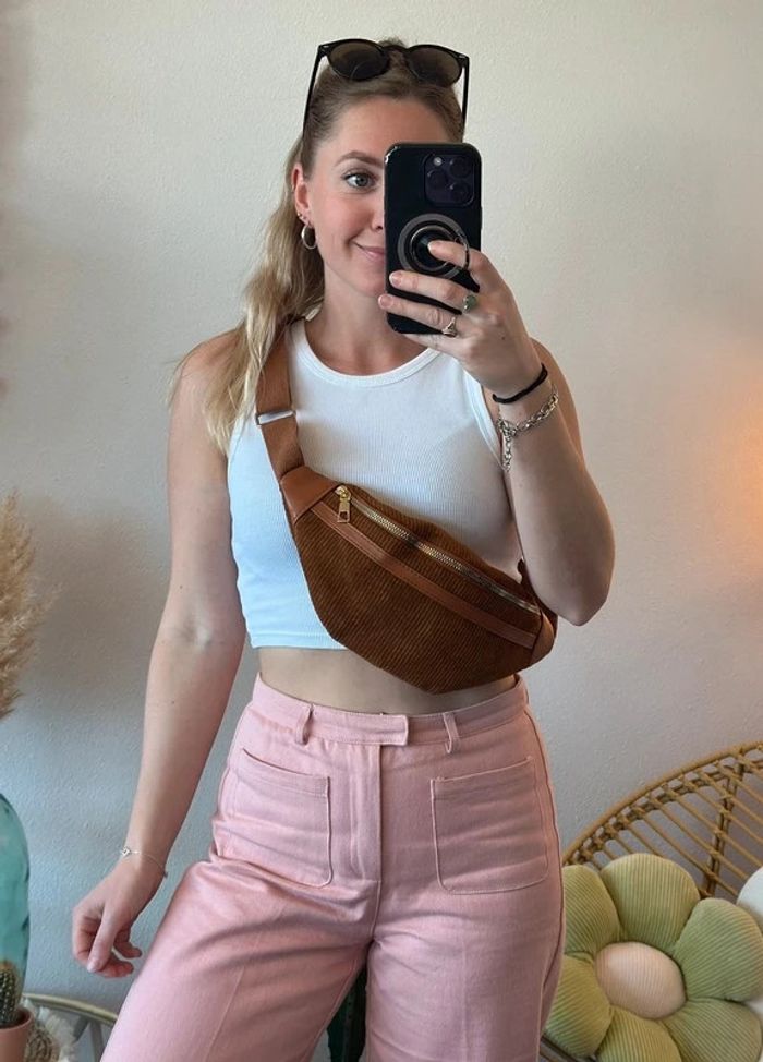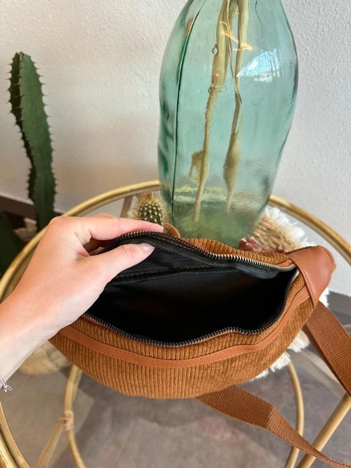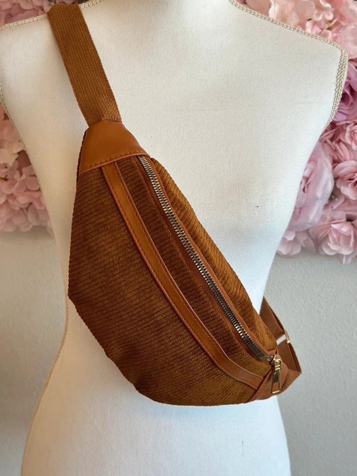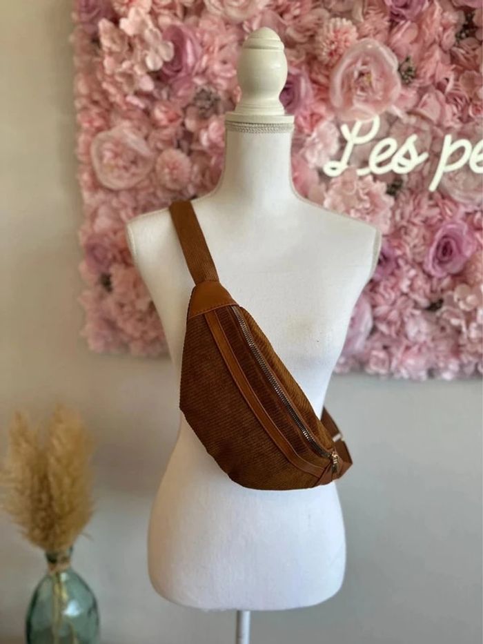 Cette ravissante banane en velours côtelé de couleur marron est fabriquée en Italie et est toute neuve. Elle se ferme sur le devant et dispose d'une anse ajustable pour un confort optimal. Dimensions : - Longueur de la bandoulière : 96 cm - Hauteur : 14 cm - Largeur : 7 cm - Longueur : 32 cm