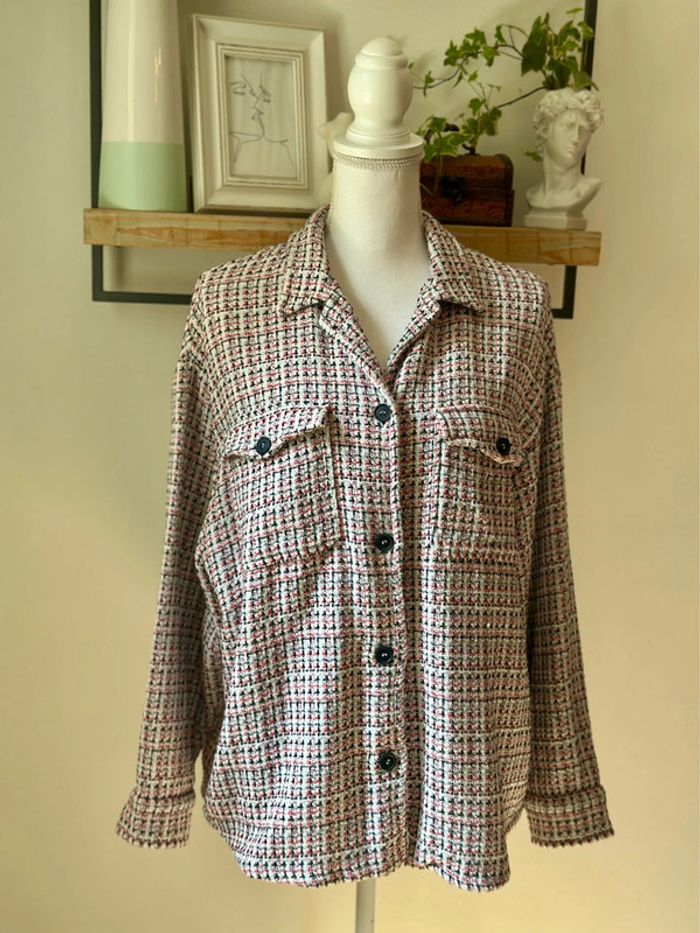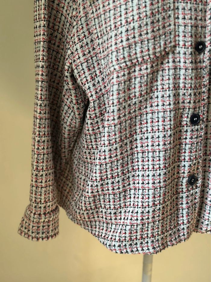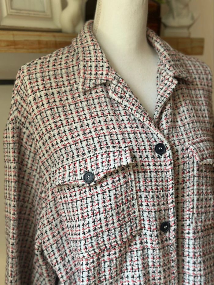 Veste épaisse type surchemise en tweed structuré à carreaux rouges, noirs et blancs, col chemise classique, manches longues boutonnées et deux poches poitrine à rabat. Coupe droite et confortable, idéale en superposition pour un style casual chic. La taille L/40 convient bien coupe ample. Très bon état. ℹ️ Photo portée générée à titre illustratif, pour vous donner une idée du rendu.