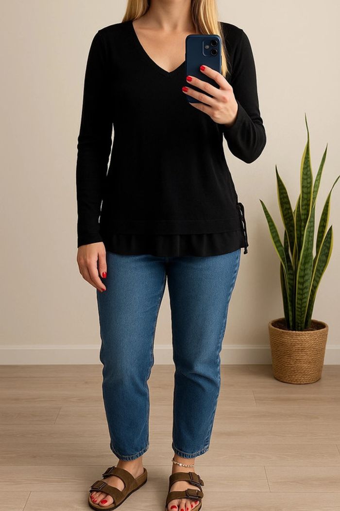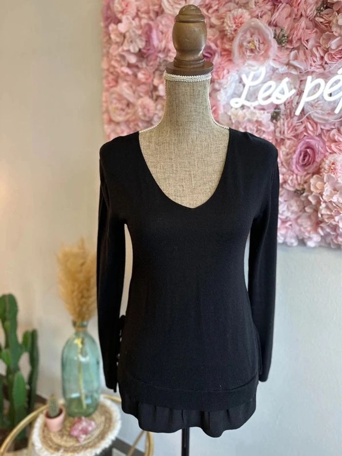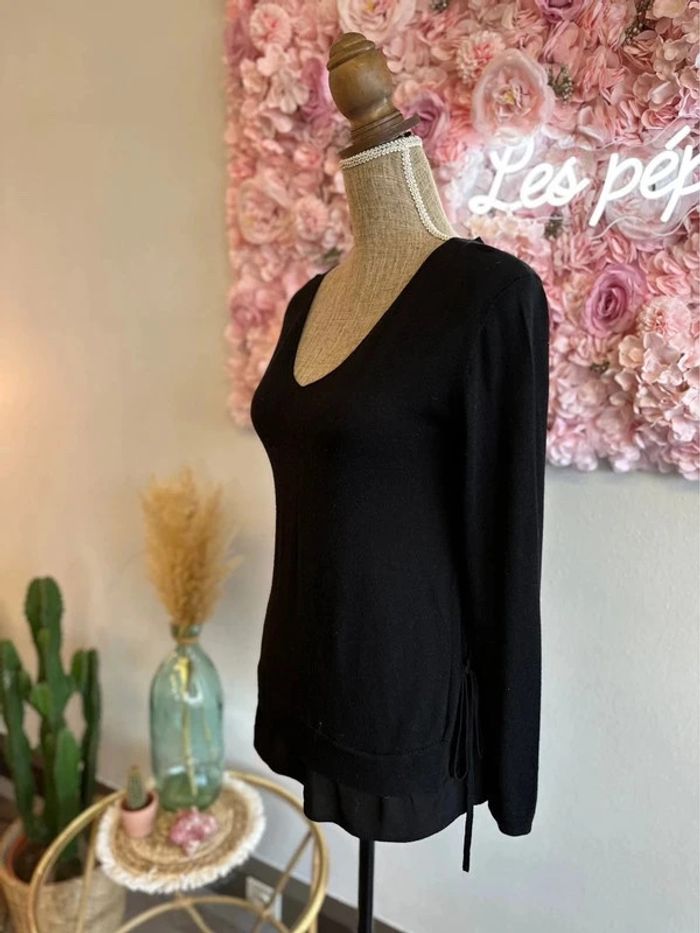 Ce charmant pull noir présente de beaux détails, notamment une toile en viscose en bas du pull avec des liens qui se resserrent, ajoutant une touche élégante à ses manches longues en coton. La taille 34 convient parfaitement, adaptée également à la taille 36. En parfait état, de la marque Caroll Paris. ℹ️ Photo portée générée à titre illustratif, pour vous donner une idée du rendu.