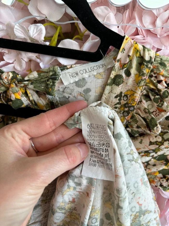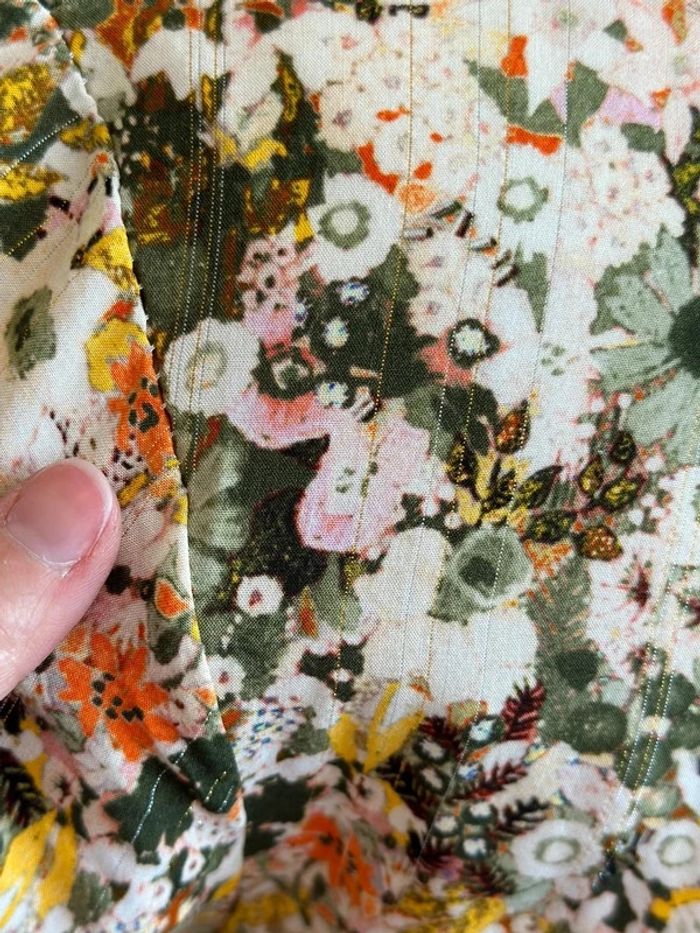 En parfait état, ravissante robe longue à motifs fleuris dans les tons de vert, jaune et orangé, avec des fils lurex argentés. Col en V avec de légers détails volantés, liens ajustables au dos et un joli dos nu. 100% viscose, fabriquée en Italie. La taille S convient bien. ℹ️ Photo portée générée à titre illustratif, pour vous donner une idée du rendu.