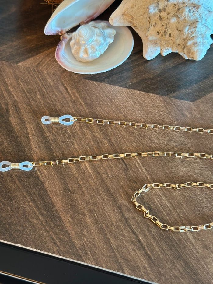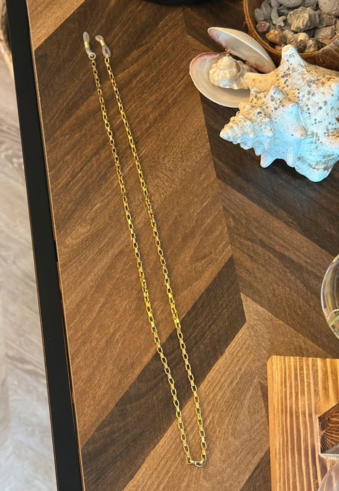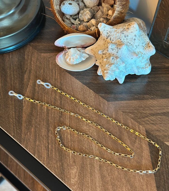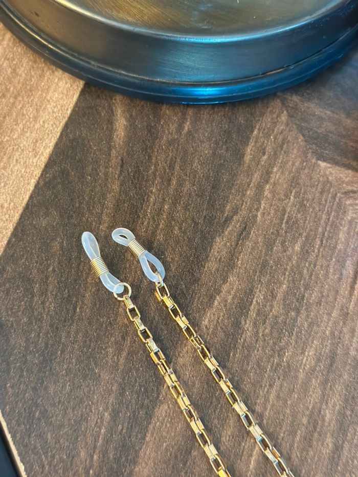 Chaîne pour lunettes en métal doré à maillons rectangulaires, légère et tendance. Les embouts en silicone transparent permettent une bonne tenue sur les branches. Style chic et pratique, parfait pour ajouter une touche élégante tout en gardant ses lunettes à portée de main. Neuf avec son emballage.