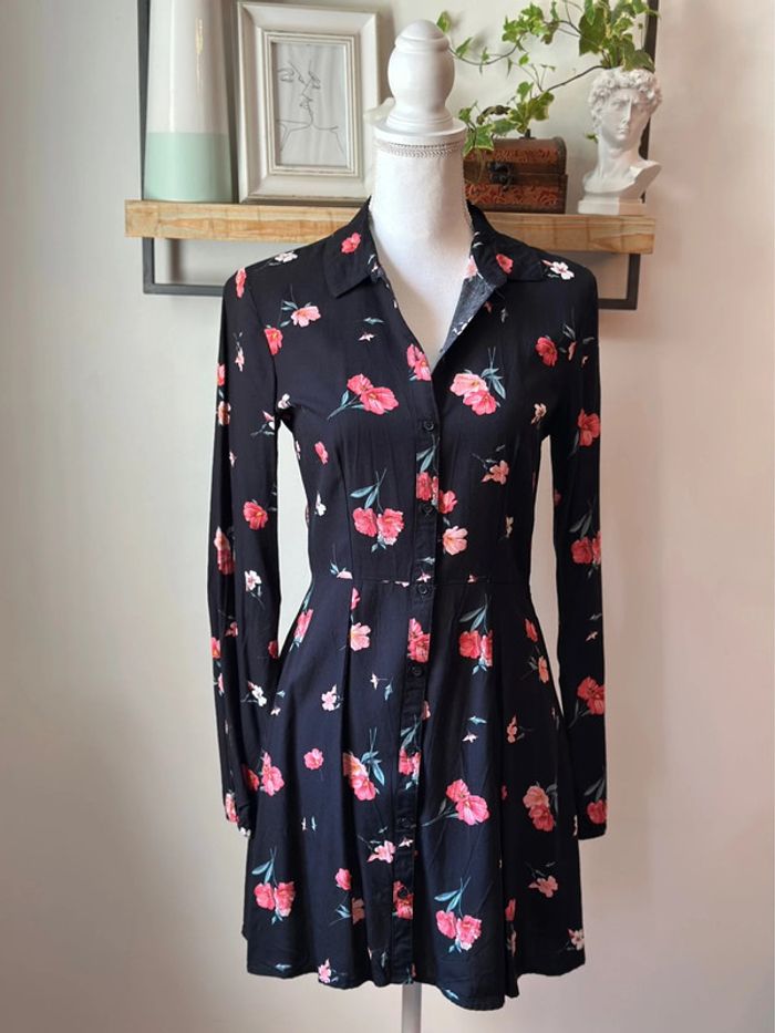 Robe noire légère à imprimé floral rouge et rose, signée H&M Divided. Coupe flatteuse, boutonnée sur toute la longueur, manches longues, col chemise et taille ajustée qui met joliment la silhouette en valeur. Confectionnée en viscose, elle est douce, agréable à porter et idéale en toute saison. Portée avec des sandales ou des bottines, elle s’adapte aussi bien au quotidien qu’à une sortie. En très bon état, peu portée. ℹ️ Photo portée générée à titre illustratif, pour vous donner une idée du rendu.